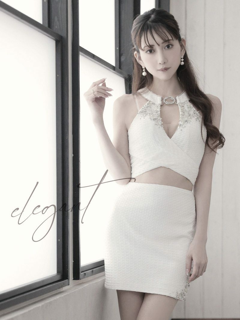 谷間を引き立てるトップスと、美脚を魅せるミニ丈スカートのセパレート仕様で、XSサイズから展開。
