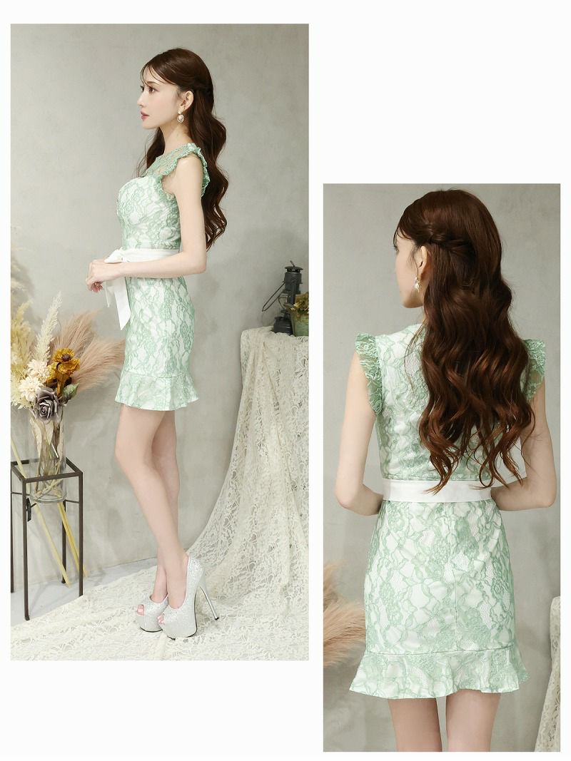 5. フロントジップ総レースフリルラグジュアリー 加賀美早紀 着用 キャバミニドレス【Belsia】(XS/S/M/L)(グリーン/グレー) ptpl