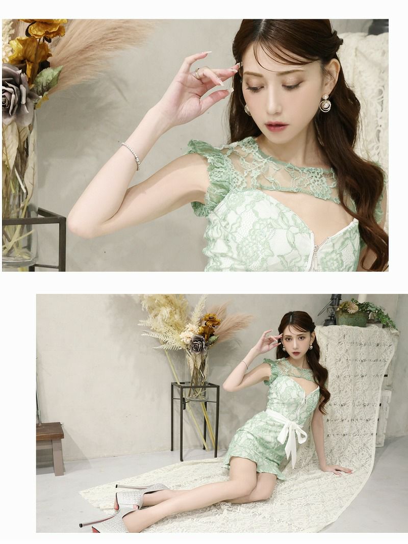 4. フロントジップ総レースフリルラグジュアリー 加賀美早紀 着用 キャバミニドレス【Belsia】(XS/S/M/L)(グリーン/グレー) ptpl