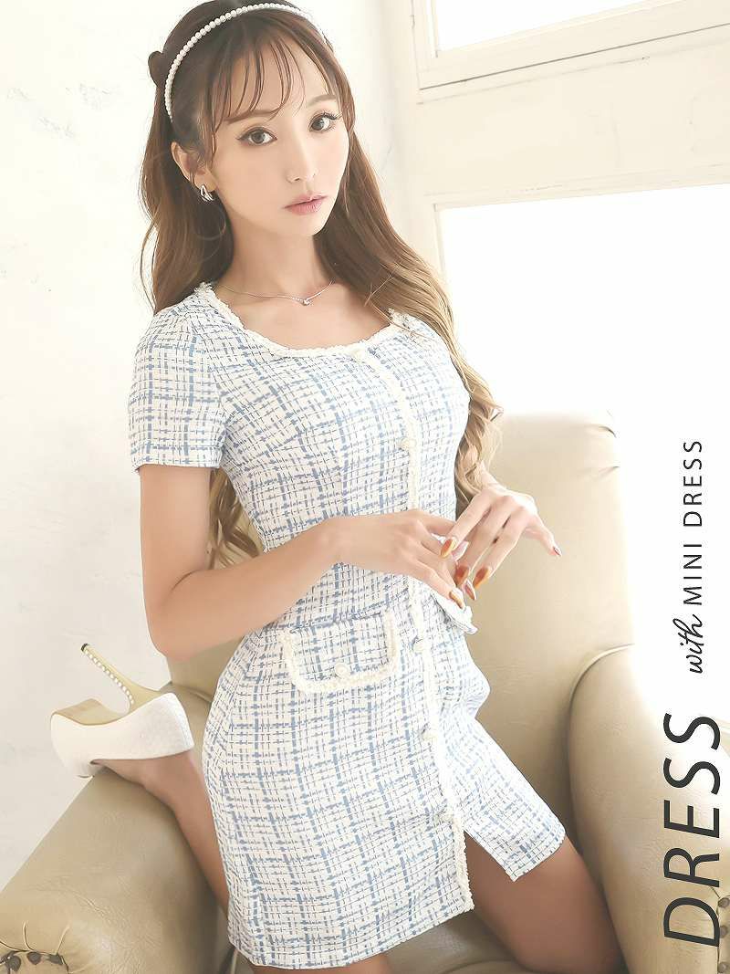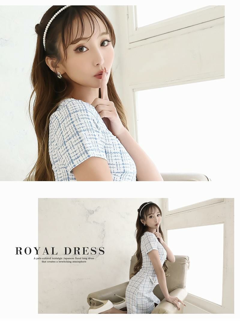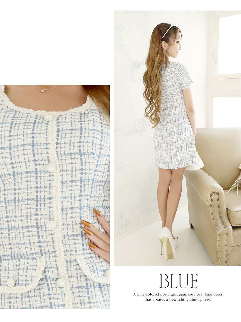チェック柄の高級感ツイードワンピ チェック柄袖付きミニワンピース タイトキャバワンピ 同伴ワンピ【Belsia】(S/M/L)(ベージュ/ブルー)