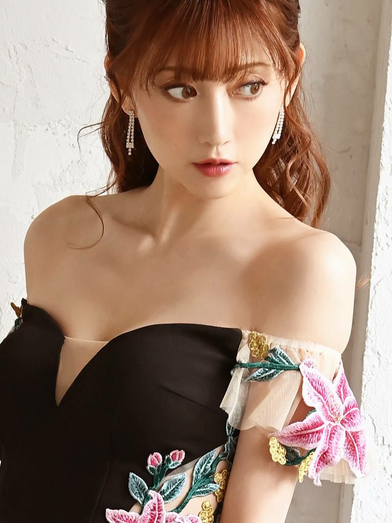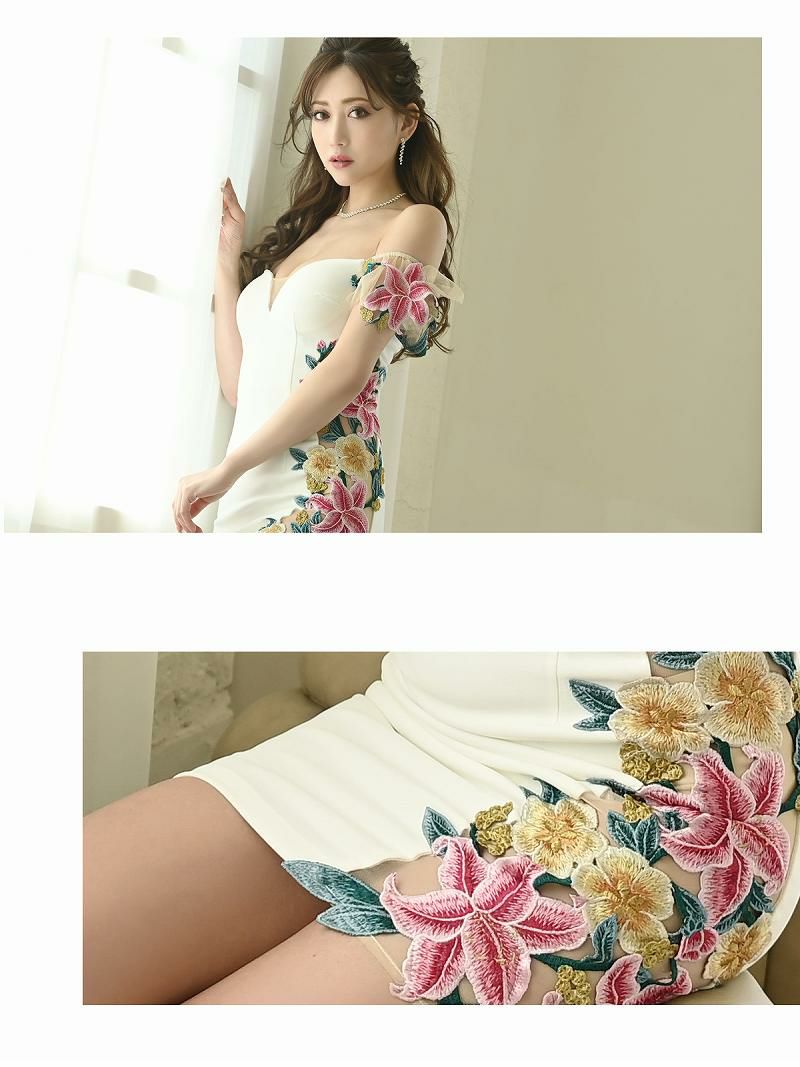 花柄とオフショルダーの組み合わせが華やかさを演出し、ナイトシーンで大活躍。