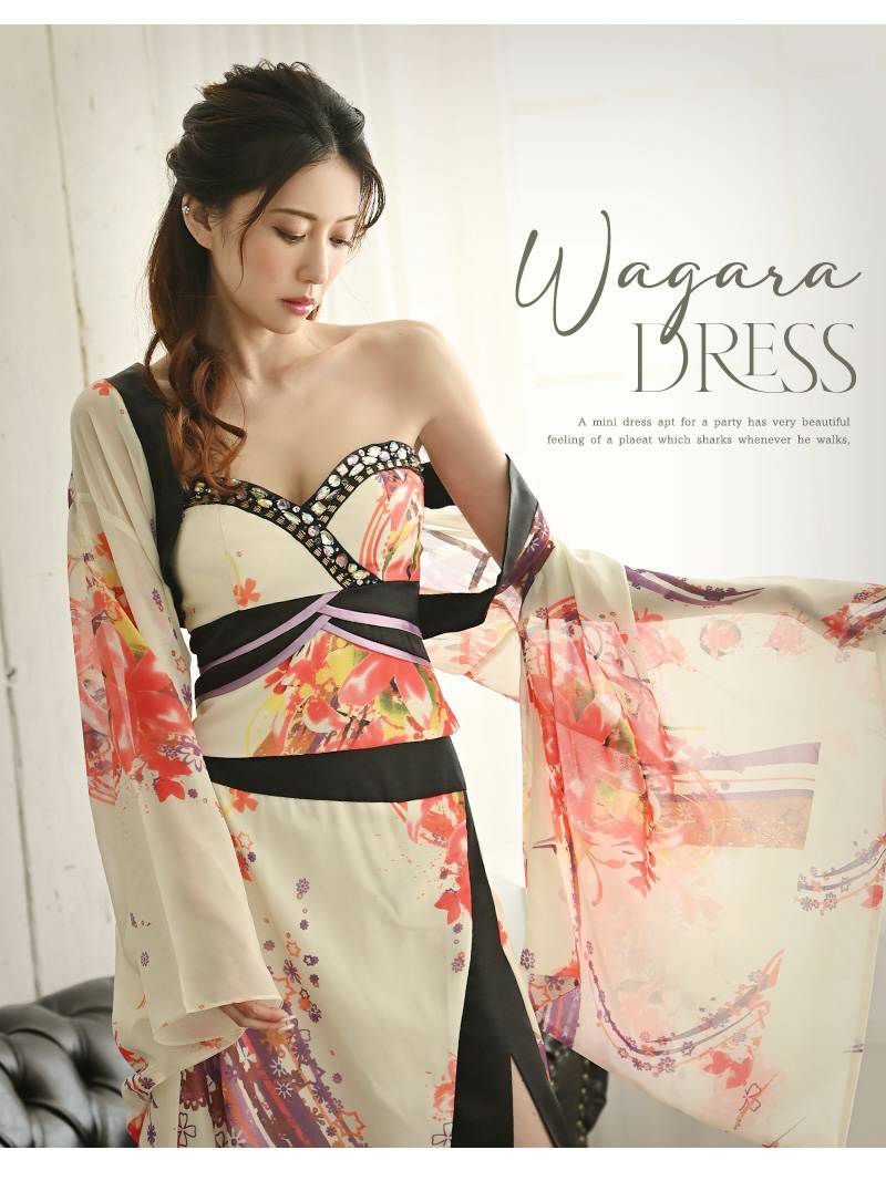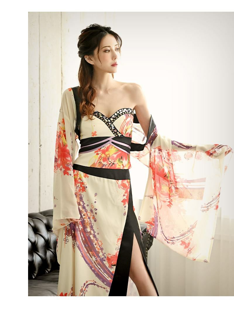 華やかな和柄が目を引く、妖艶なホワイトの花魁風ドレス。ベアトップ仕様でデコルテを美しく魅せ、大人の色気を引き立てる一着。