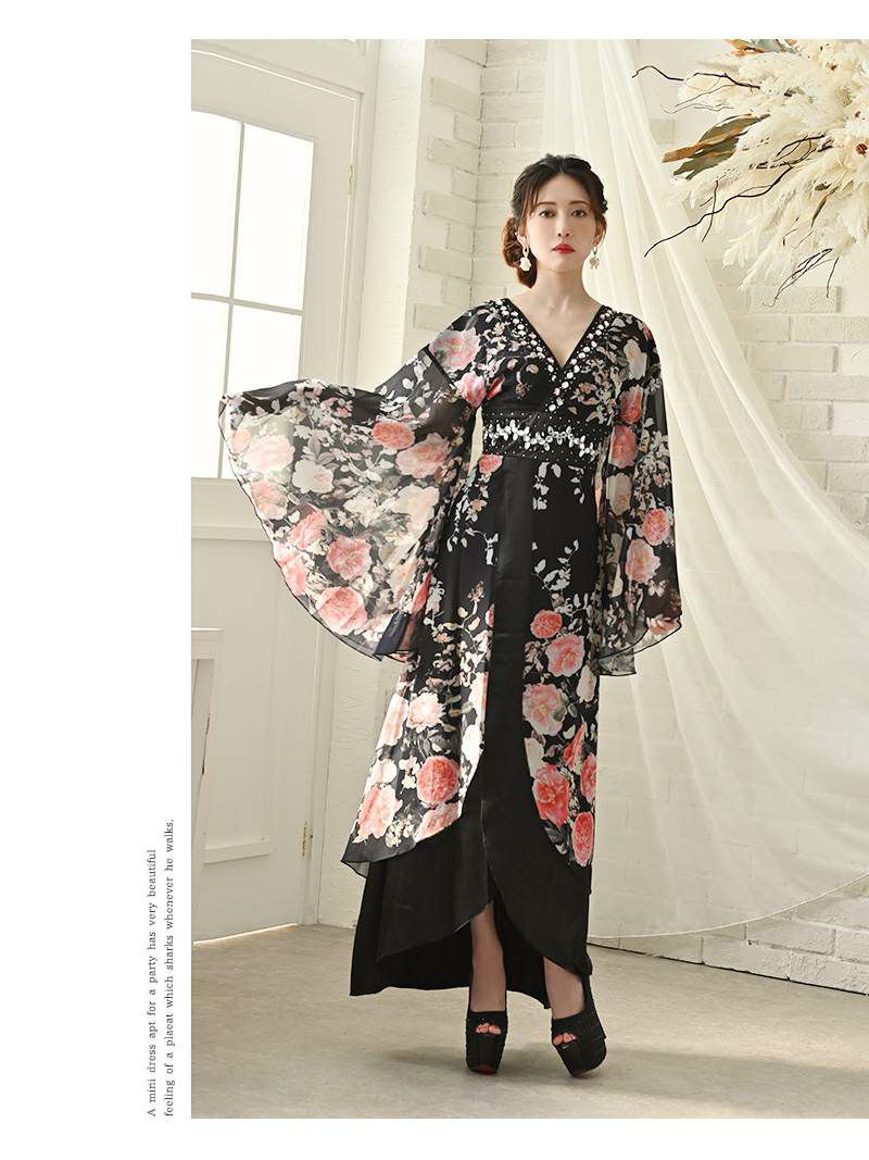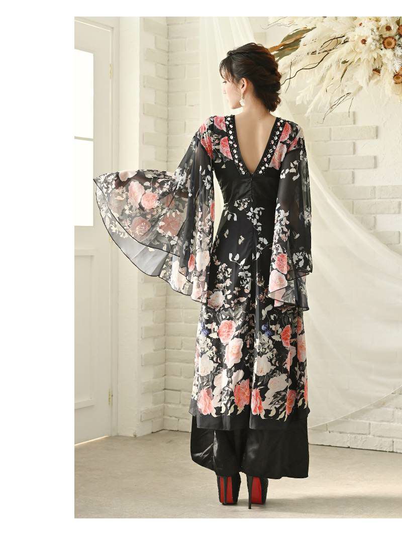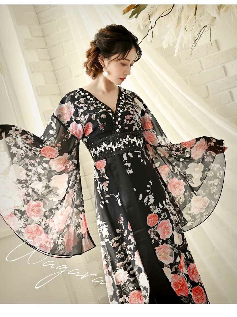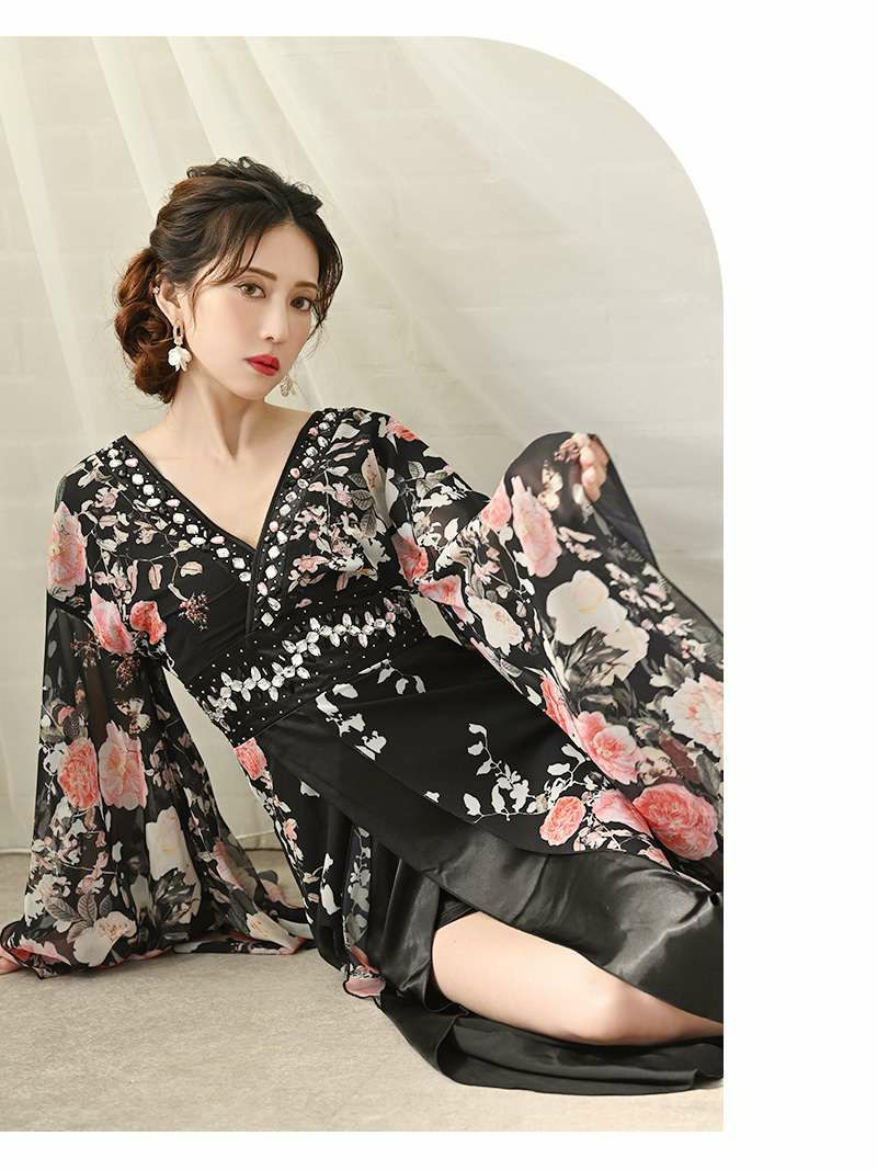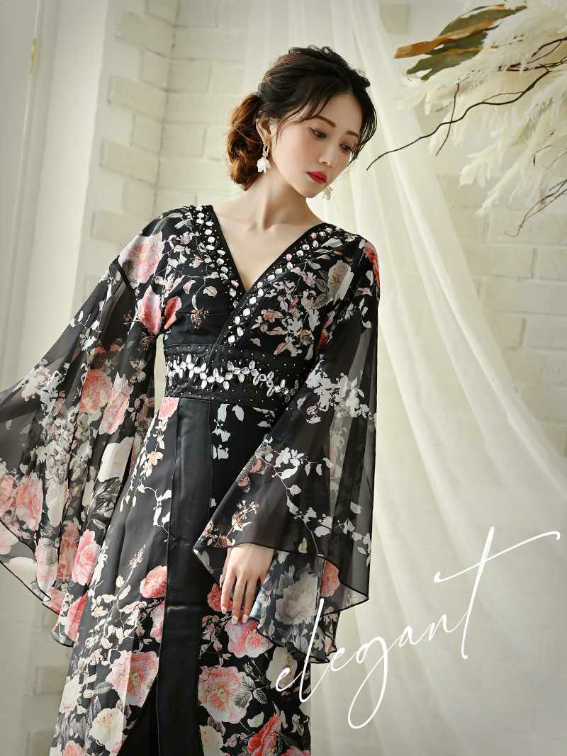 花魁スタイルを現代風にアレンジした、漆黒の美しさが際立つ和柄ドレス。袖付きデザインが上品さをプラスし、スリット入りのロングシルエットが大人の色気を引き立てます。