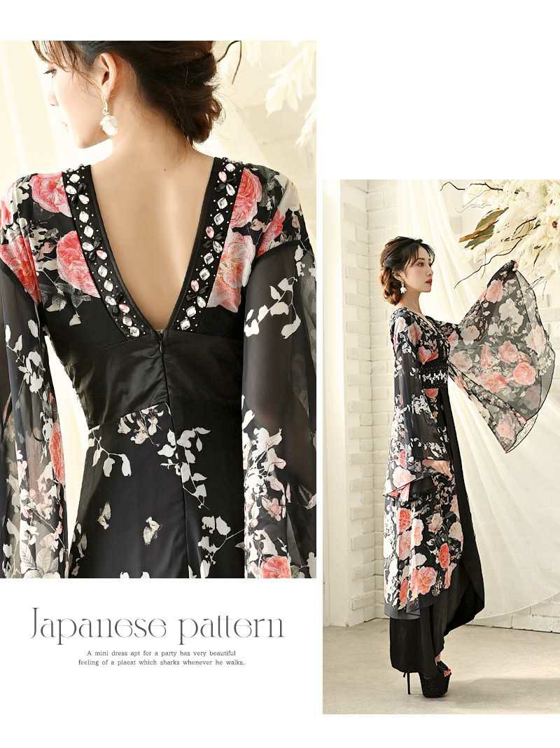 訳あり花魁ブラック 【訳ありアウトレット】漆黒の優美大人ブラック袖付き和柄ドレス【流遊】(S/M/L/XL)(ブラック)