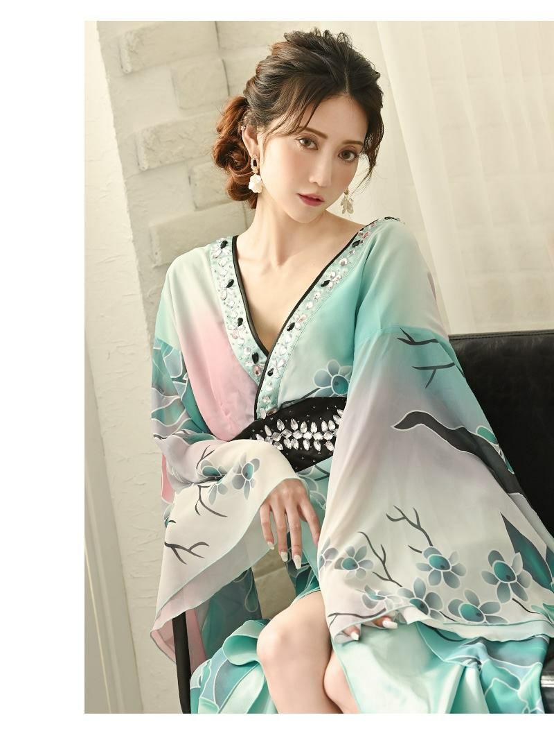 グラデーションが際立つデザインで、キャバクラや特別なイベントにぴったり。花魁ドレスとしてはもちろん、着物ドレスとしても和の美しさを存分に楽しめる一着。