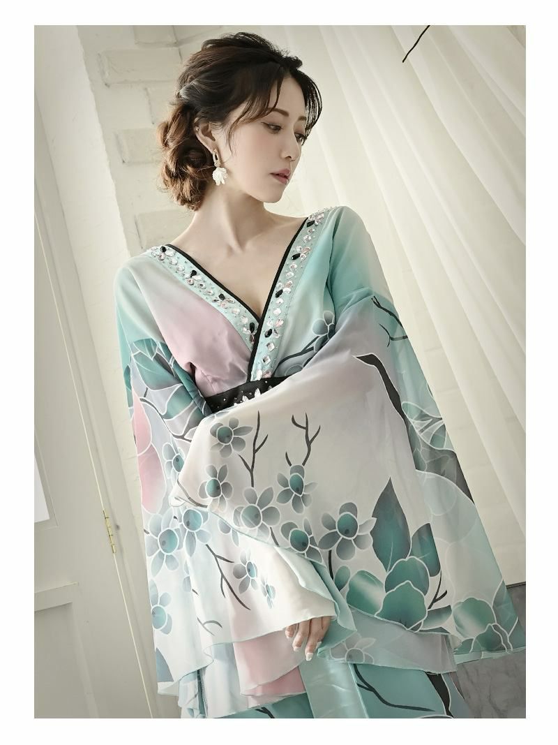 翠や碧の美しい和色が織りなす、上品でセクシーな和柄ドレス。流れるようなロングシルエットが大人の色気を引き立て、華やかな花柄が豪華な印象を演出します。