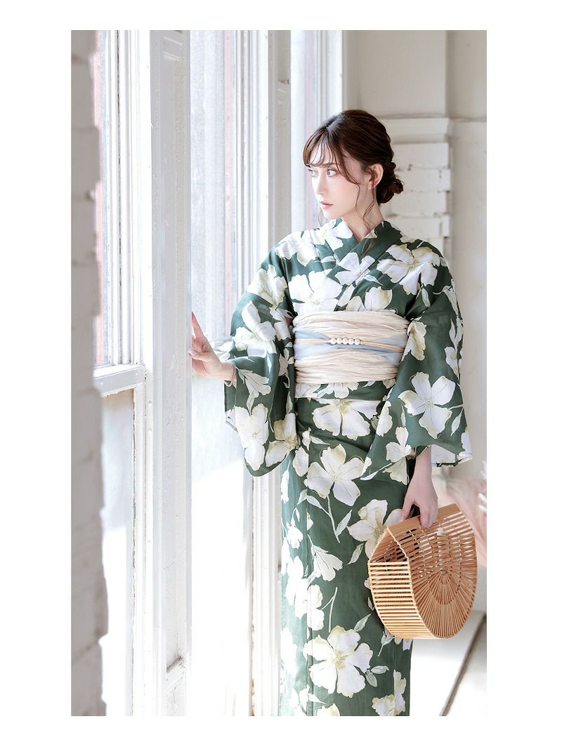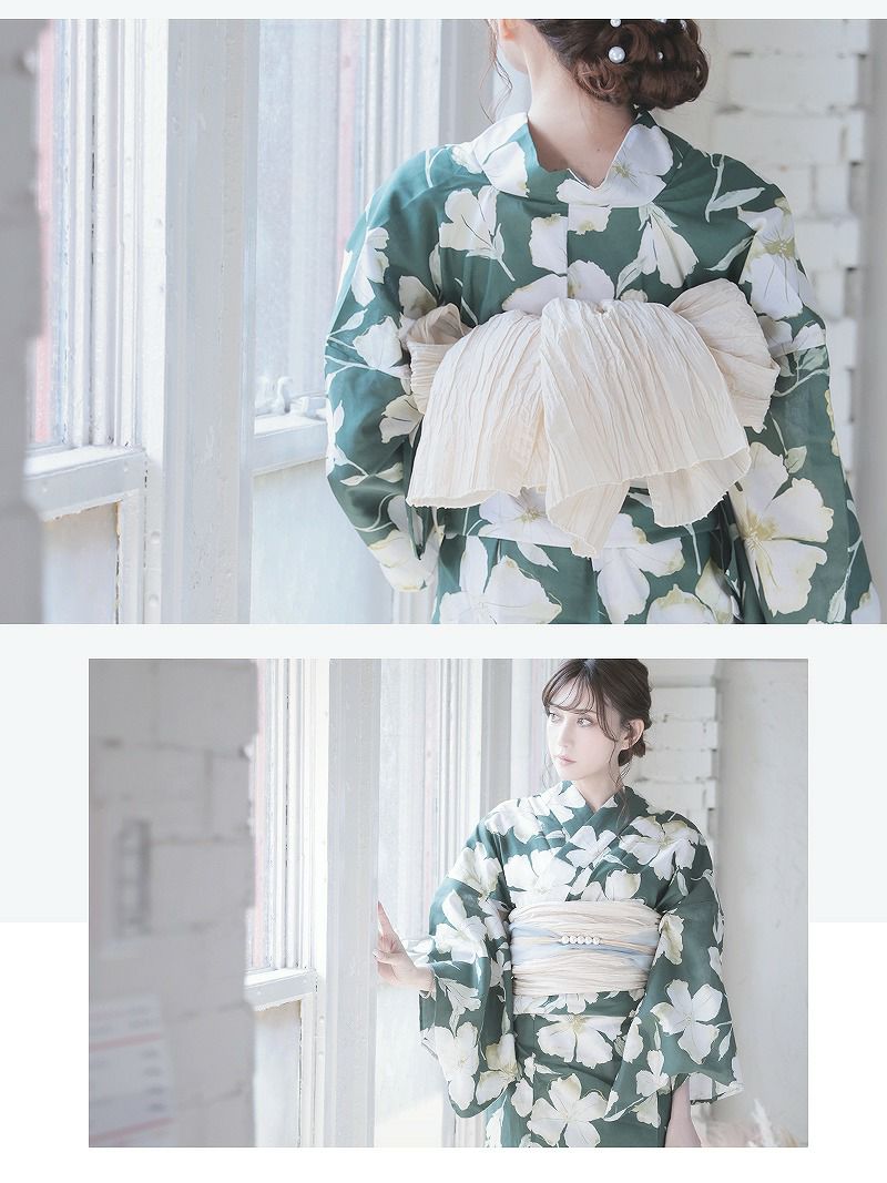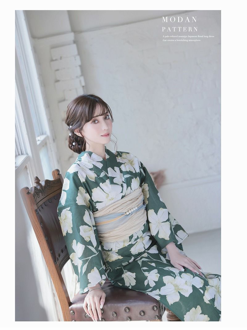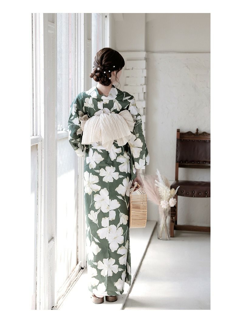 深みのあるグリーンと爽やかなホワイトを基調にした牡丹と花柄が美しいレディース浴衣です。