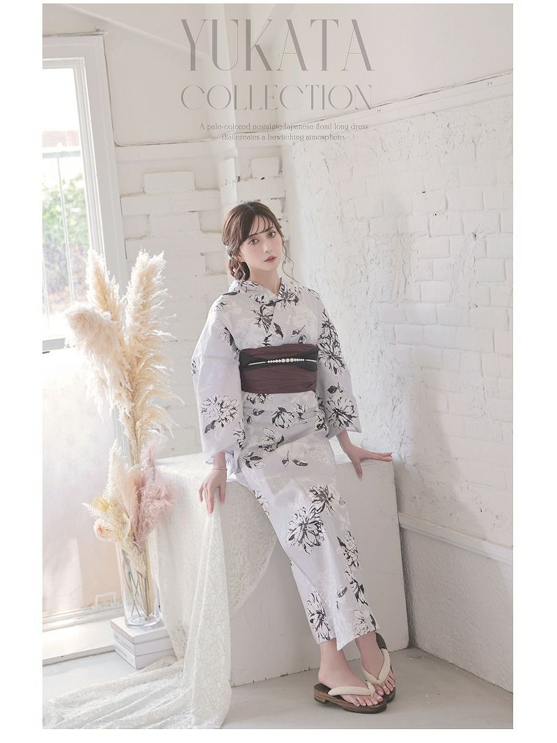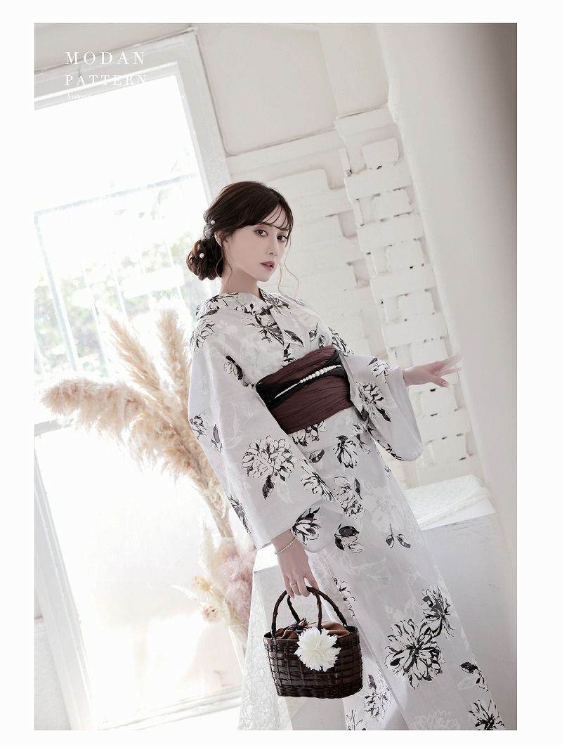 白×ベージュの上品な色合いに花柄が映える、女性用浴衣の2点セットです。