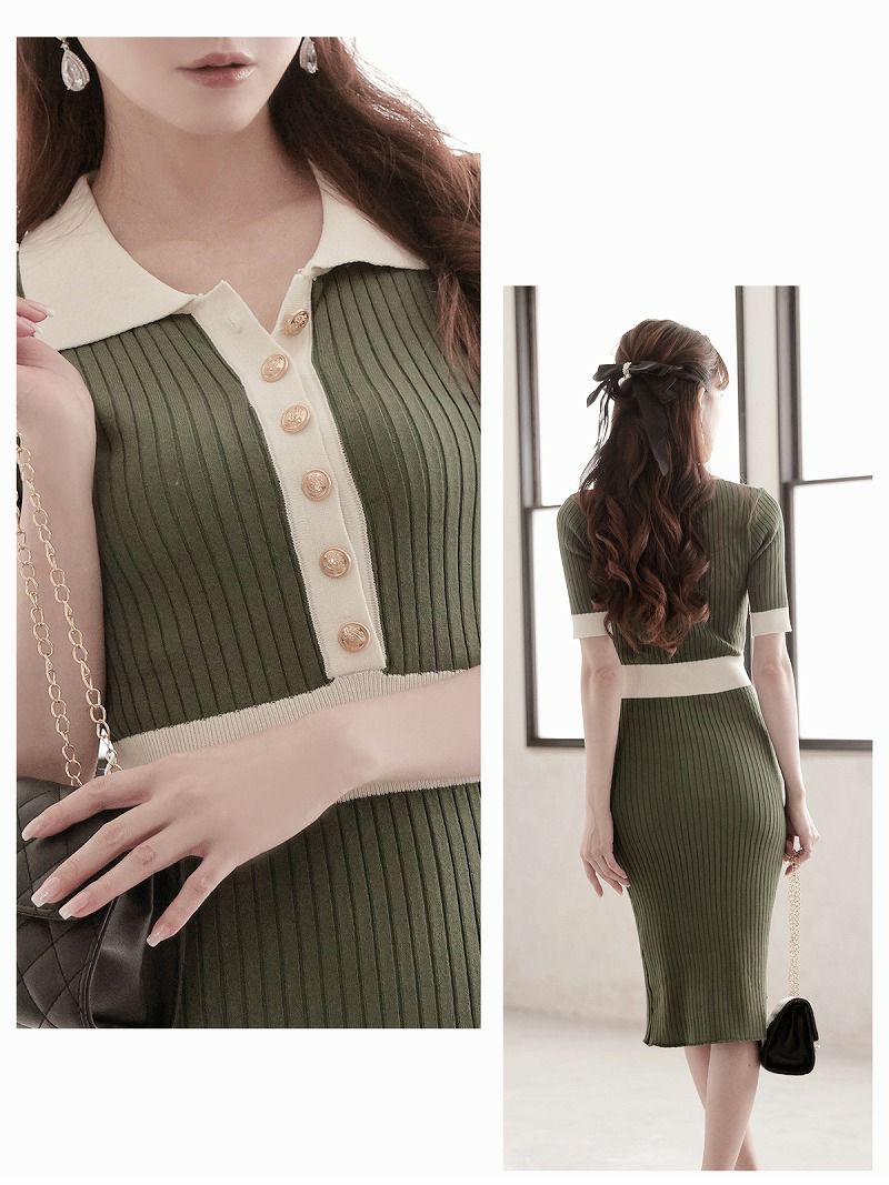 4. 先行予約割¥6980→¥6630!※一部予約販売※上品美シルエット半袖ニットキャバワンピース 加賀美早紀 着用 キャバドレス【Belsia】(M)(ネイビー/グリーン)