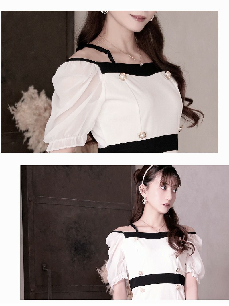 5. クラシカルシフォン袖オフショルミディ丈キャバワンピース 加賀美早紀 着用 キャバドレス【Belsia】(S/M/L/XL(2L))(ブラック/ホワイト)