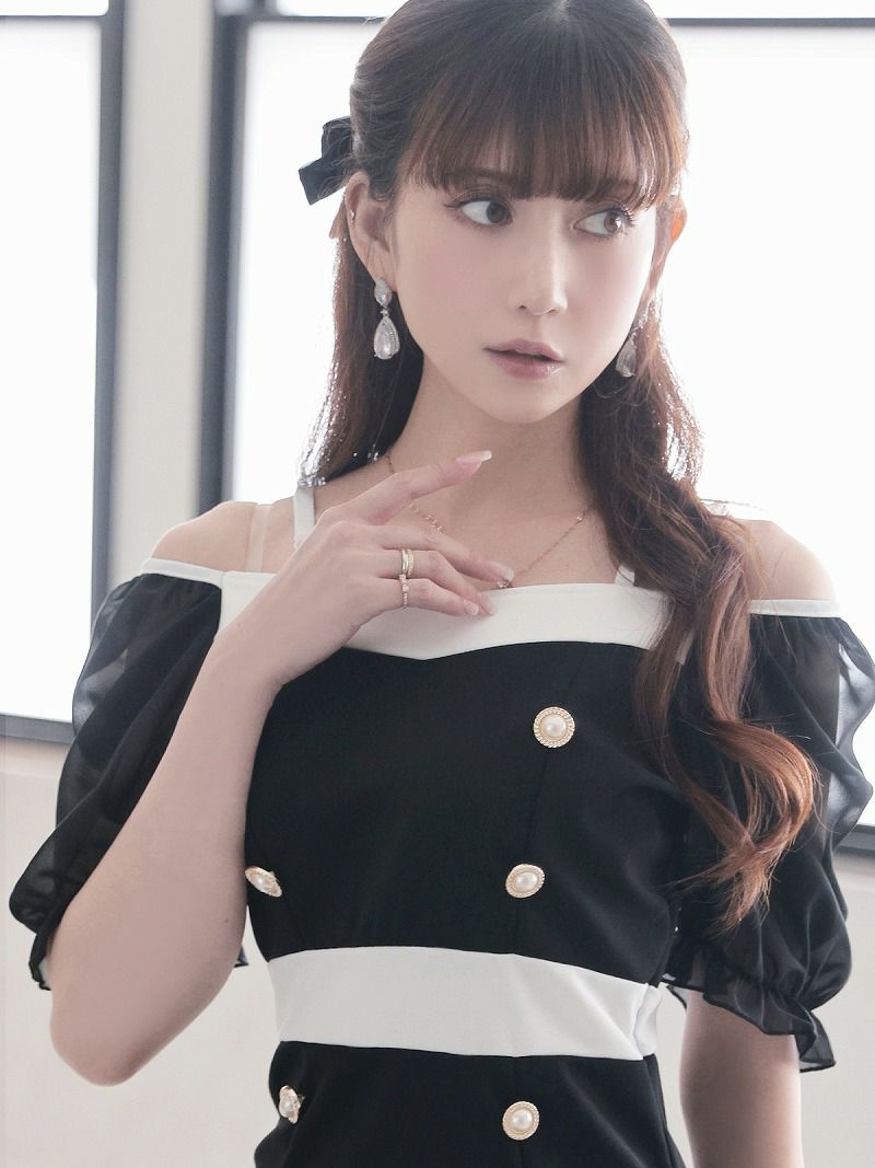6. クラシカルシフォン袖オフショルミディ丈キャバワンピース 加賀美早紀 着用 キャバドレス【Belsia】(S/M/L/XL(2L))(ブラック/ホワイト)