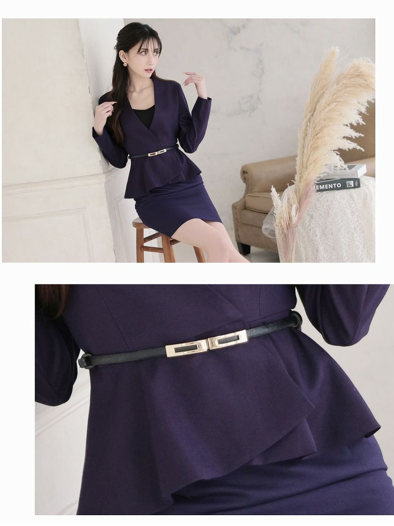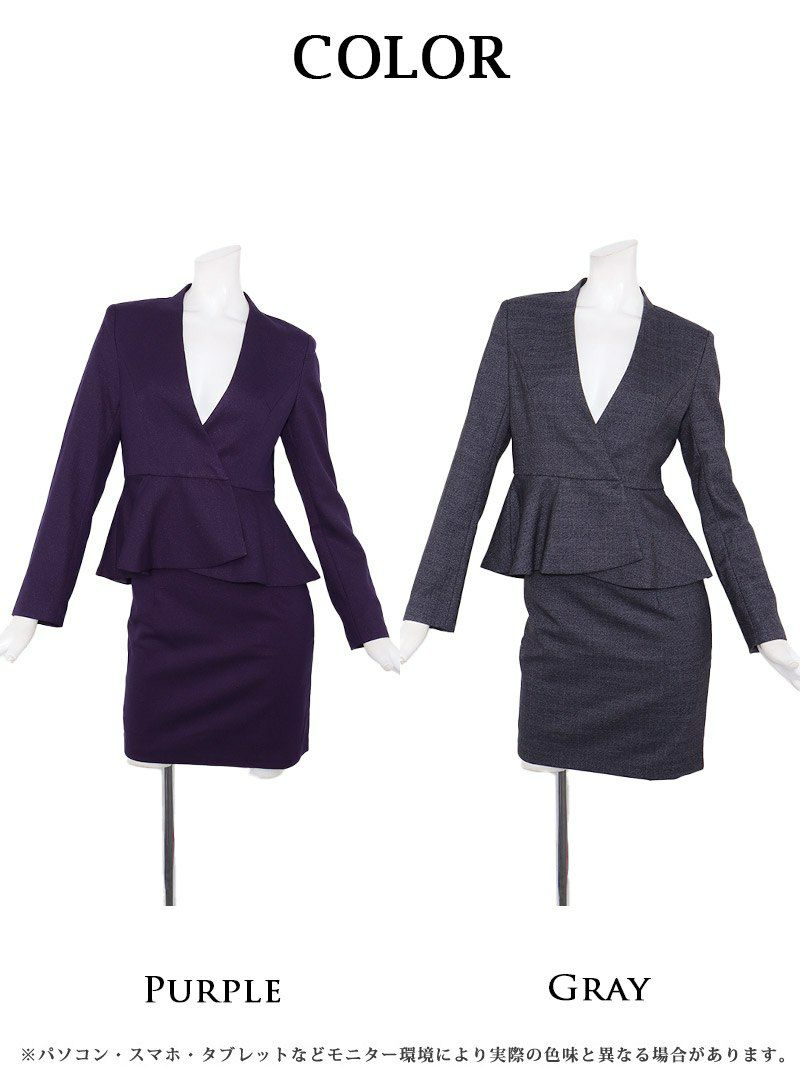 高級感漂うノーカラーとペプラムの魔法で、凛とした美しさを纏う。 先行予約割¥13800→¥13109!※一部予約販売※上質ノーカラージャケット&タイトミニスカートセットアップフォーマルスーツ 加賀美早紀 着用 キャバドレス【BelsiaLUX】(S/M/L/XL(2L))(パープル/グレー)