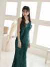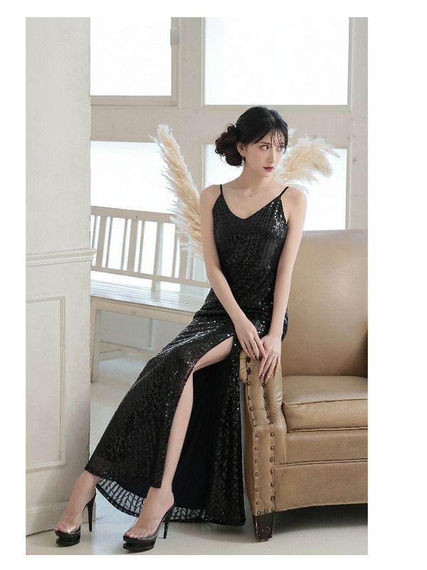 全身に散りばめられたスパンコールが、店内の照明を反射して圧倒的な存在感を放つロングドレスです。