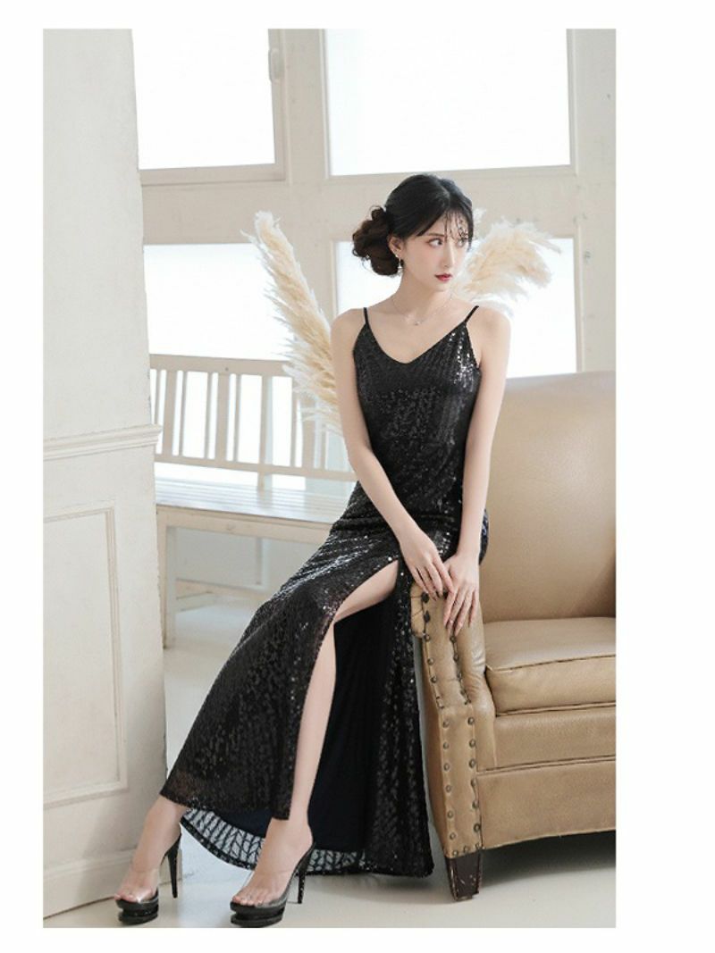 スパンコール幾何学柄深スリットキャミソールタイトマーメイドロングドレス 加賀美早紀 着用キャバドレス【Belsia】