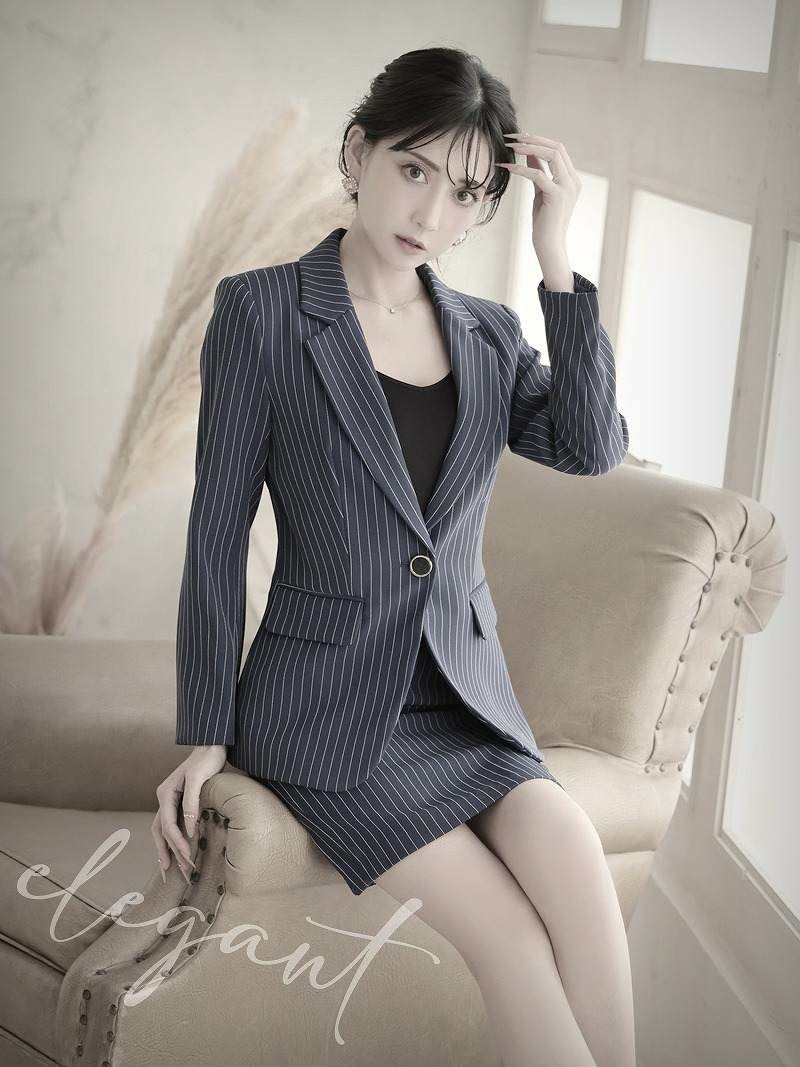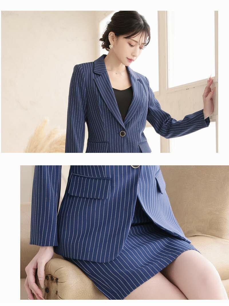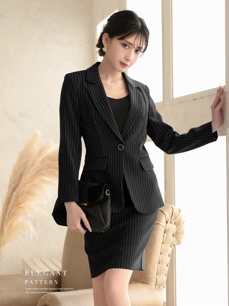 凛とした知的な女性を演出する、上質なピンストライプ柄のセットアップスーツです。