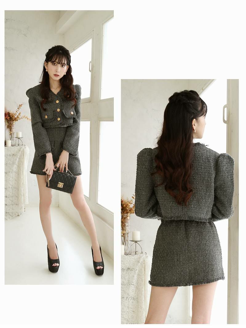 クラシカルな大人可愛いモテスーツ スーパーSALE¥9790→¥7832! グレーツイードシャギー韓国風キャバスーツ 加賀美早紀 着用セットアップスーツ【Belsia】(S/M/L)(グレー)