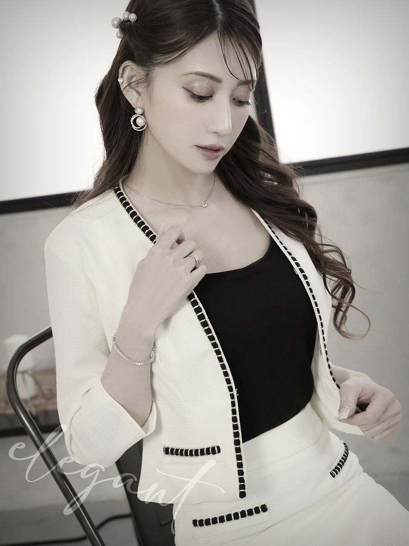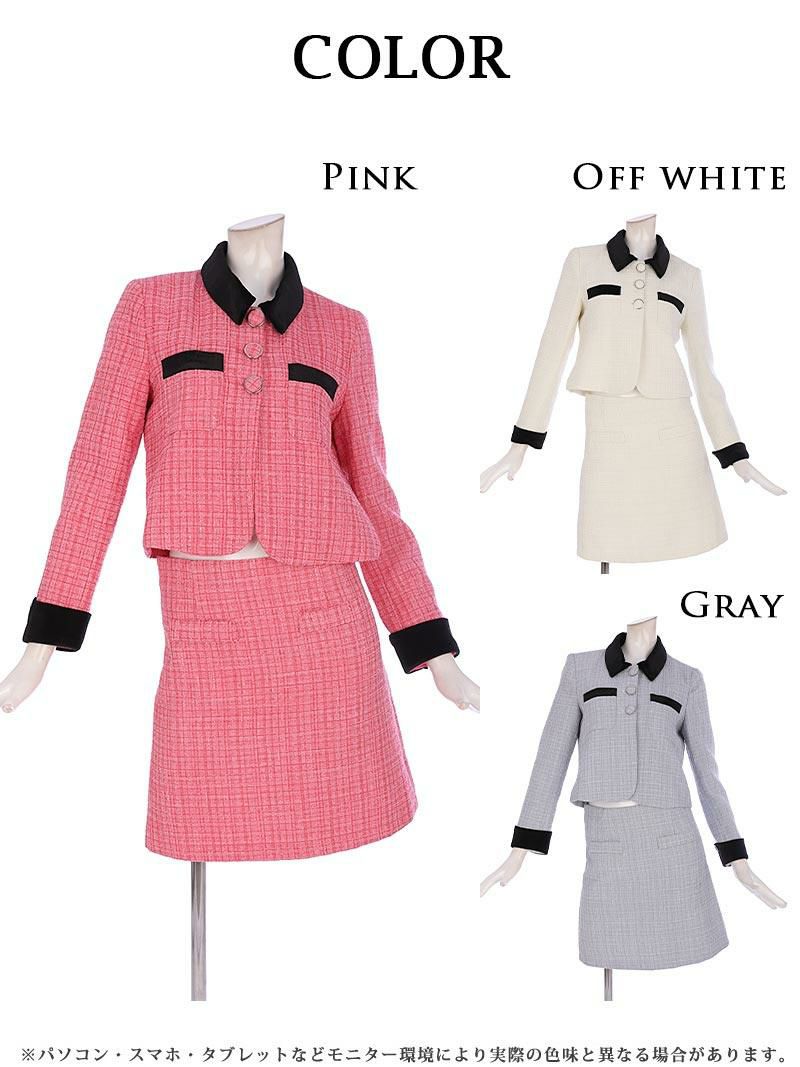 バイカラーでエッジがきいた韓国風セットアップ スーパーSALE¥12800→¥11520! ボレロ風ジャケットツイードキャバスーツ 加賀美早紀 着用セットアップ【BelsiaLUX】(S/M/L)(オフホワイト/ピンク/グレー)