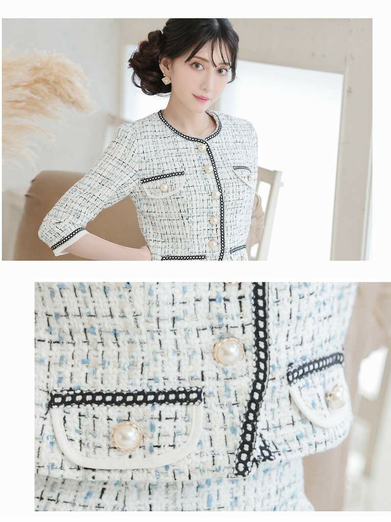 上品さの中に可愛さも秘めたママスーツ! スーパーSALE¥11880→¥9504! カラーツイードパイピングチェック柄レディースフォーマルスーツ 加賀美早紀 着用 キャバスーツ【BelsiaLUX】(S/M/L)(ブラック/ブルー)