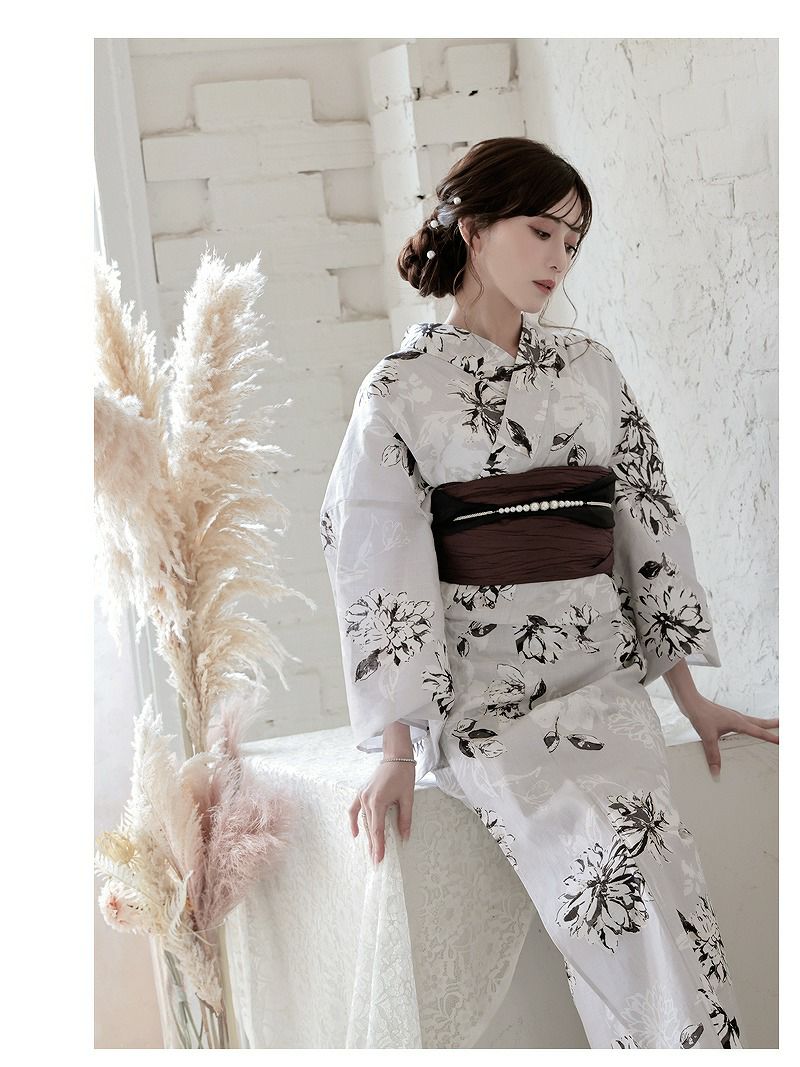 白黒の美しさで魅せる、大人の上品浴衣。 浴衣 モノトーン小花柄シックレディース浴衣 加賀美早紀 着用 2点セット浴衣【Ryuyu】(フリーサイズ)(ホワイト)