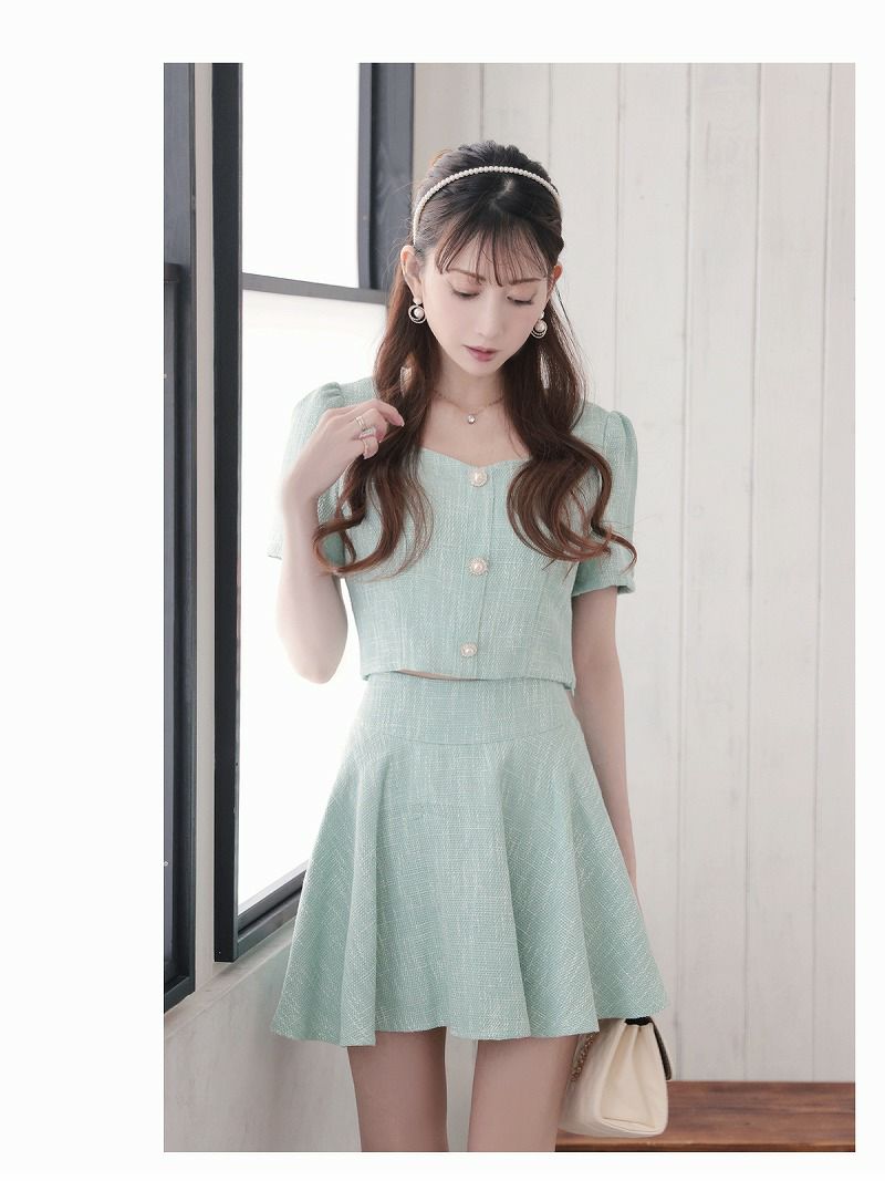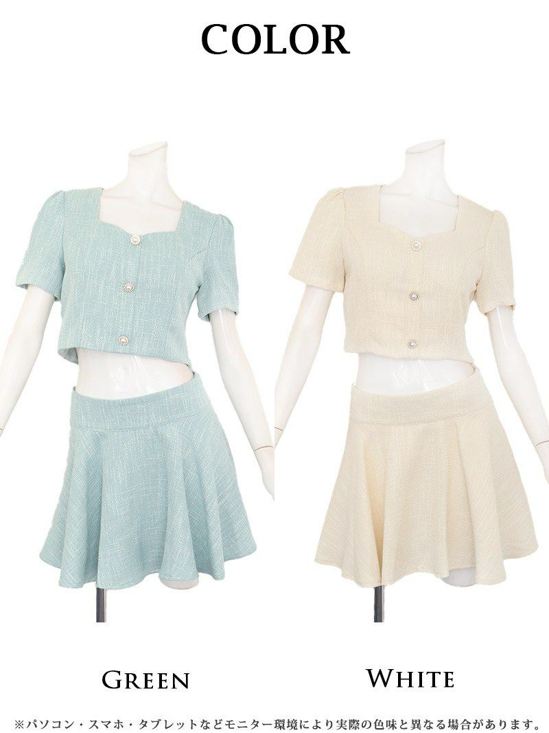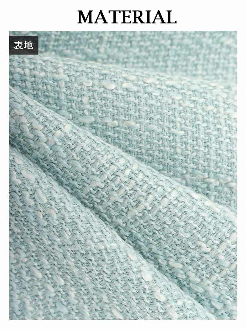 華やか顔周りスッキリカラースーツ♪ スーパーSALE¥9880→¥6915! ノーカラーミックスツイードミニ丈フォーマルスーツ 加賀美早紀 着用 キャバスーツ【BelsiaLUX】(S/M/L)(ブラック/オフホワイト/ミント)