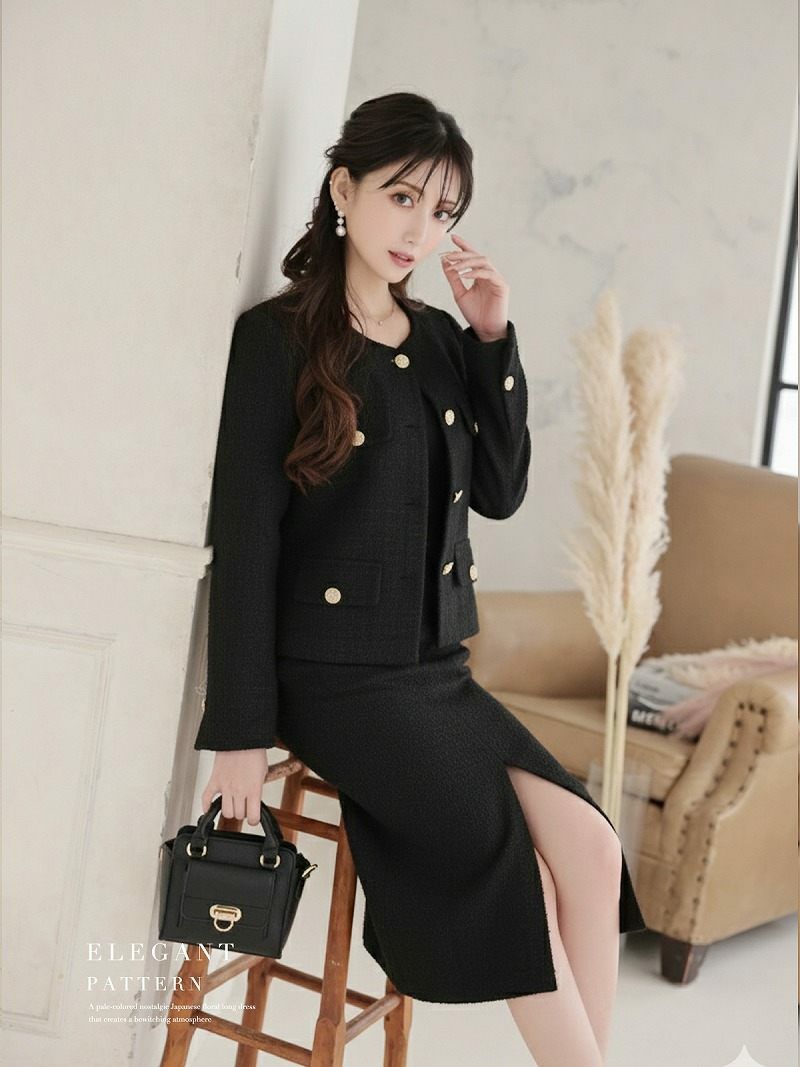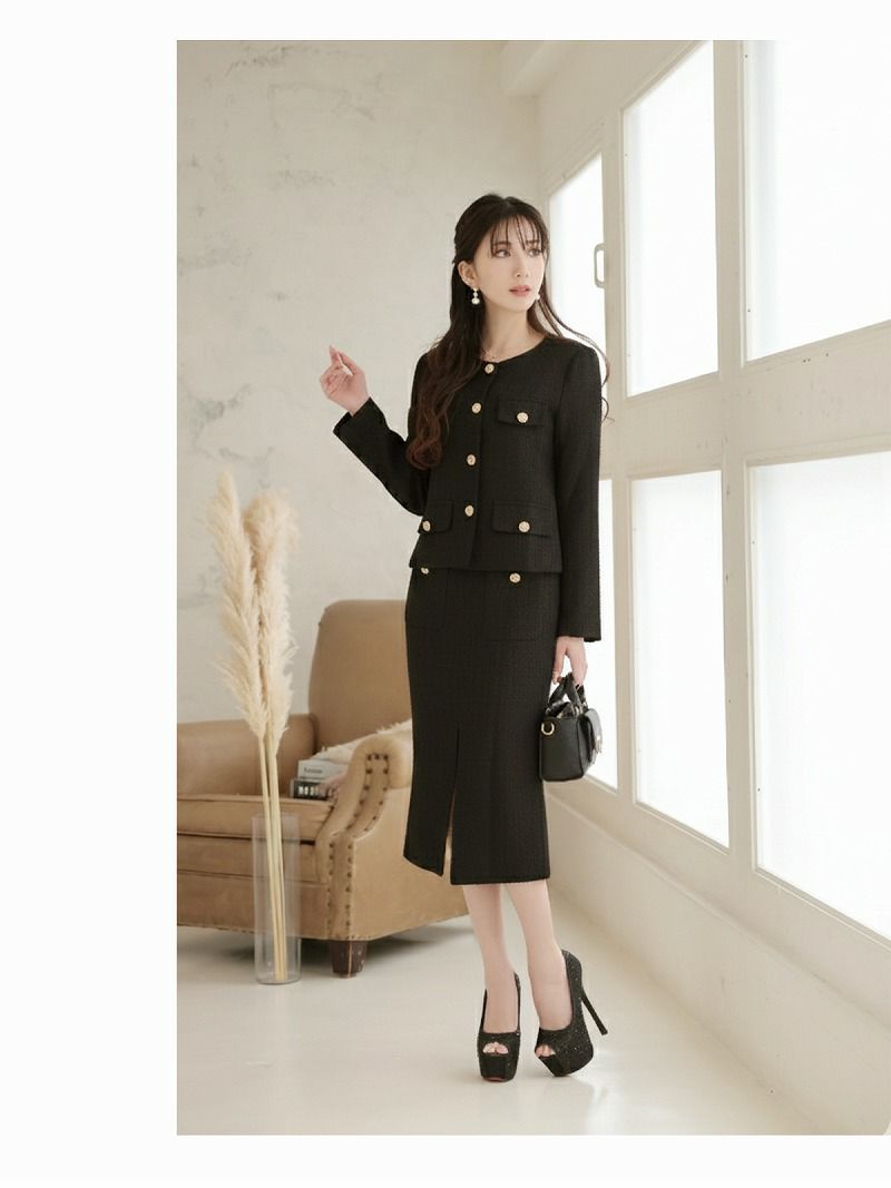上品な華やかさで彩る♪ スーパーSALE¥9480→¥8532! 膝丈デザインカラーツイードレディーススーツ 加賀美早紀 着用 キャバスーツ 【Belsia】(S/M/L/XL(2L))(ブラック/ピンク)
