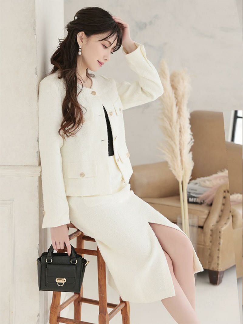 ゴールドボタンが煌めく、ツイード素材の気品あふれるタイトセットアップ。 先行予約割¥13800→¥13109!※一部予約販売※ノーカラーツイードゴールドボタンセットアップスーツ 加賀美早紀 着用 キャバスーツ【Belsia】(S/M/L/XL(2L))(ブラック(S/M/XL/3月下旬)/オフホワイト(S/M/3月下旬))