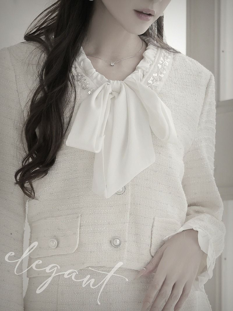 煌めくラメ入りツイードとボウタイリボンで、圧倒的な気品を纏う正統派セットアップスーツ。 先行予約割¥10800→¥10260!※一部予約販売※ボウタイリボンラメ入りツイードセットアップスーツ 加賀美早紀 着用 キャバスーツ【Belsia】(S/M/L/XL(2L))(ホワイト/ブルー)