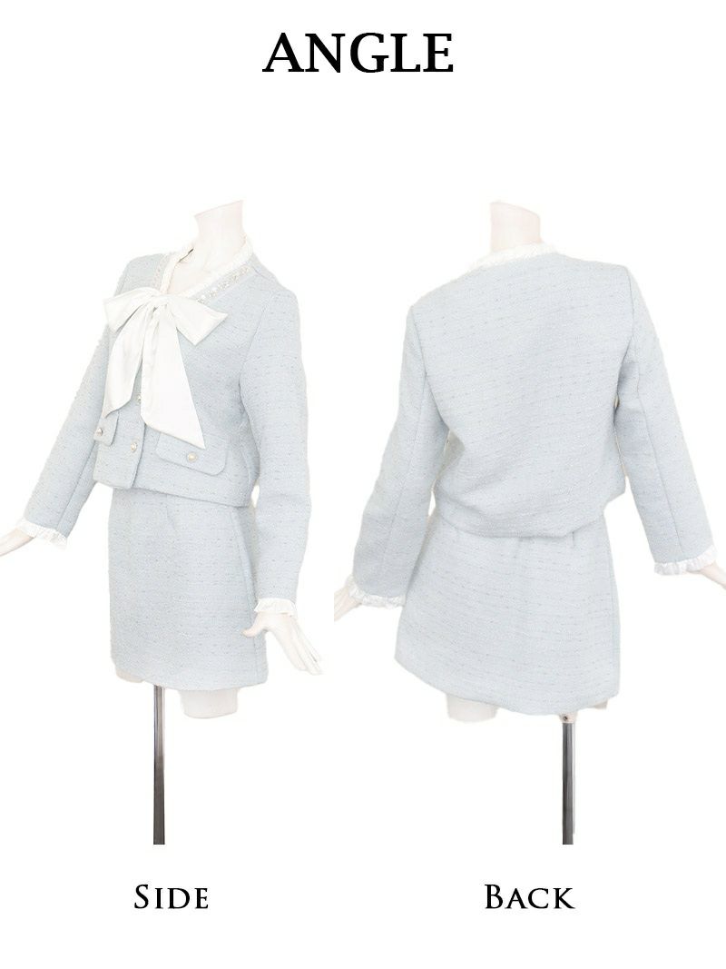 大きなリボンと煌めくビジューに視線が集中する、清楚可愛い最旬ツイードセットアップ。 先行予約割¥10800→¥10260!※一部予約販売※ボウタイリボン付きビジューボタンツイードセットアップミニスーツ 加賀美早紀 着用 キャバスーツ【Belsia】(S/M/L/XL(2L))(ホワイト/ブルー)