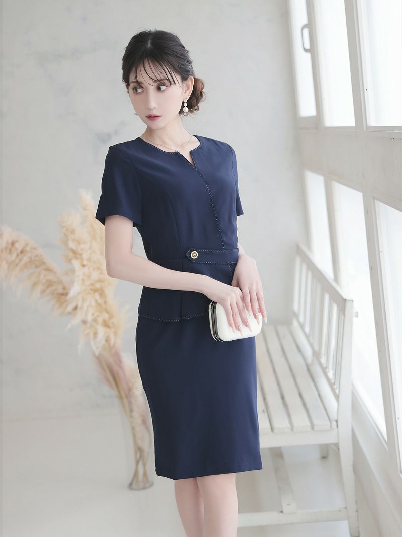 知的なステッチ使いと金ボタンが映える、大人の色気を引き出すタイトワンピース。 先行予約割¥7980→¥7581!※一部予約販売※ステッチデザイン金ボタンベルト付き半袖タイト膝丈キャバワンピース 加賀美早紀 着用 ワンピース【Belsia】(S/M/L/XL(2L)/XXL(3L))(ブラック/ネイビー)