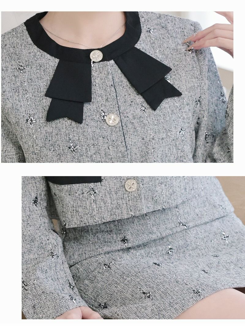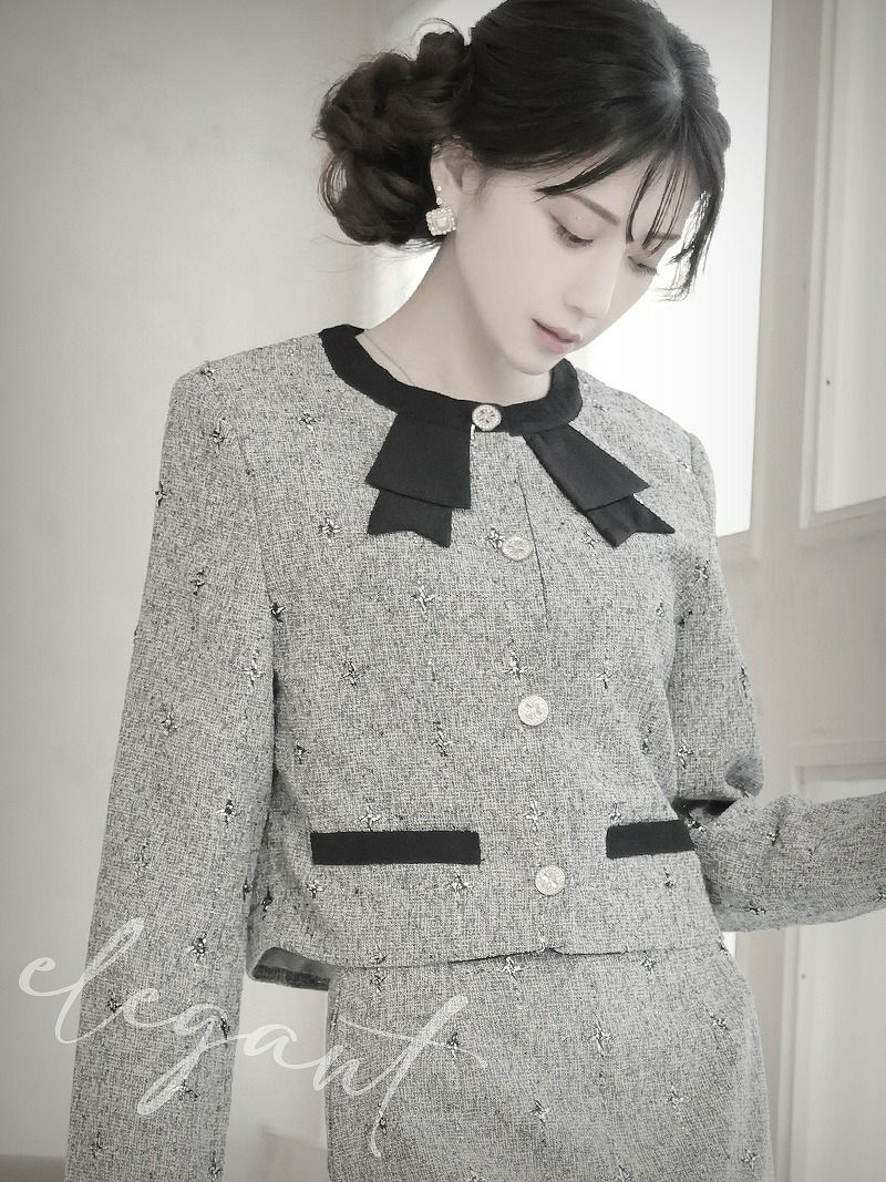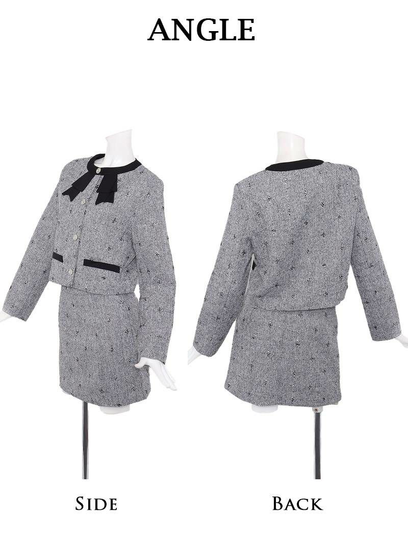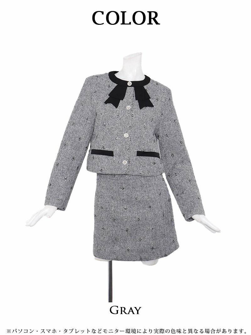 ラメツイードとリボンで魅せる、清楚で大人可愛い格上げセットアップスーツ。 大人可愛いリボンデザインラメツイードセットアップスーツ 清楚なノーカラータイトスカート式スーツ 加賀美早紀 着用 キャバドレス【Belsia】(S/M/L/XL(2L))(グレー)