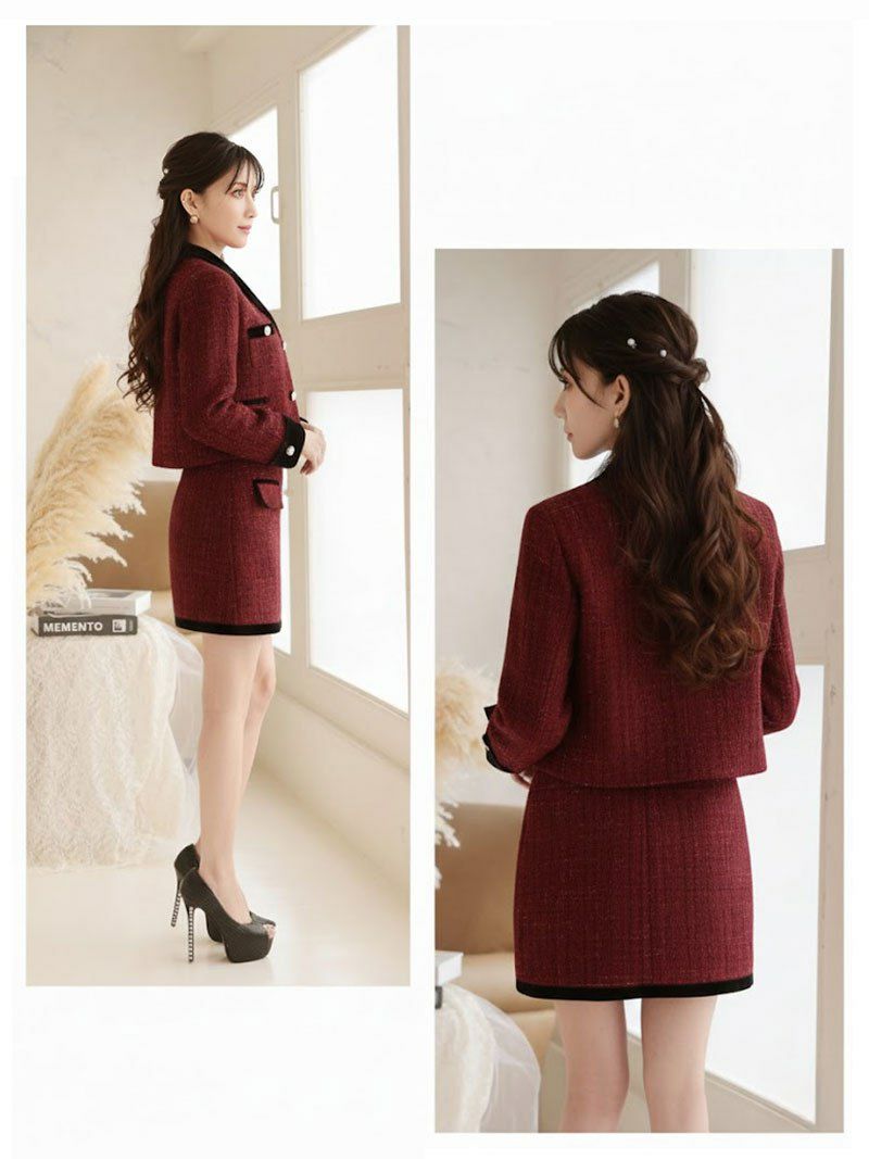 金ボタンが煌めくツイードセットアップで、誰よりも凛とした気品を纏う。 先行予約割¥9900→¥9405!※一部予約販売※襟付き金ボタンツイードジャケット×タイトミニスカートセットアップ フォーマルキャバドレス 加賀美早紀 着用キャバスーツ【Belsia】(S/M/L/XL(2L))(ブラック/レッド/ベージュ)