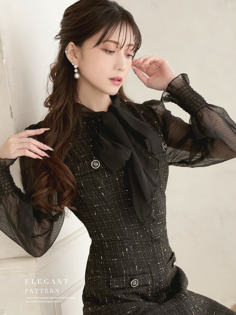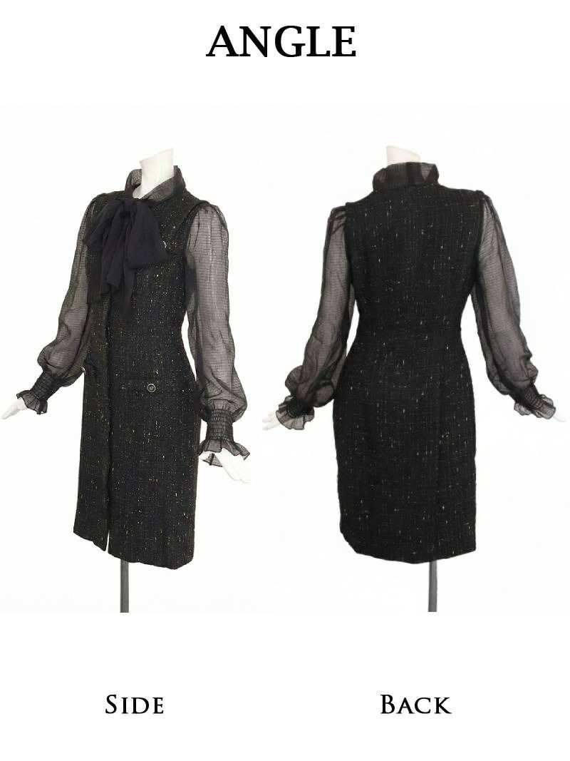 シアー袖とツイードの異素材ミックスで魅せる、上品リッチな大人の膝丈タイトドレス! 先行予約割¥7980→¥7581!※一部予約販売※ボウタイリボンが目を惹くツイードシフォン袖付き膝丈タイトキャバワンピース 加賀美早紀 着用ワンピース【Belsia】(S/M/L/XL(2L))(ブラック)