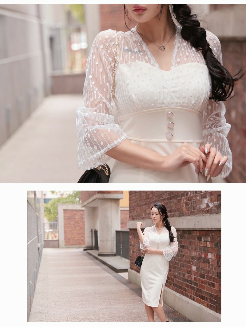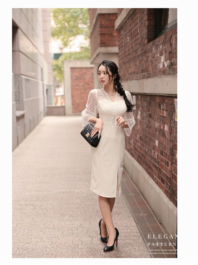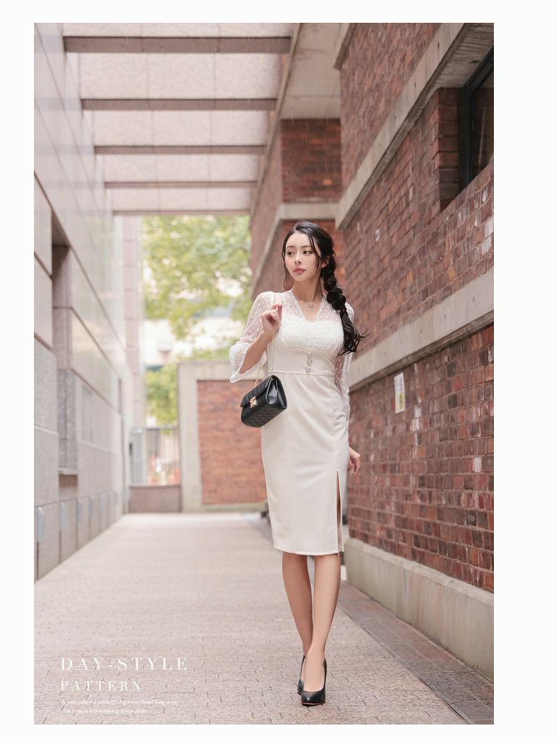 4. レース袖付きKANO着用 韓国キャバワンピース【DAYS PIECE】(S/M/L/XL(2L))(アイボリー/ブラック) ptpl