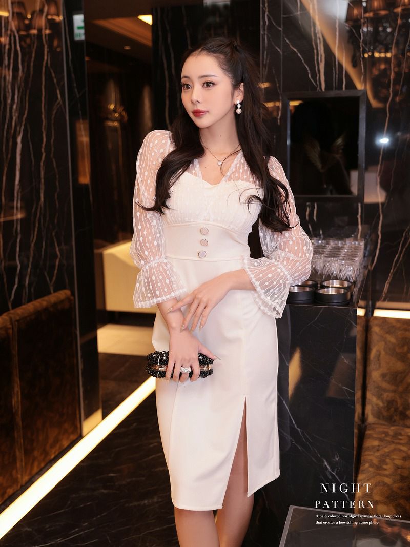 レース×ドット柄がガーリーさを引き立てる韓国キャバドレス。