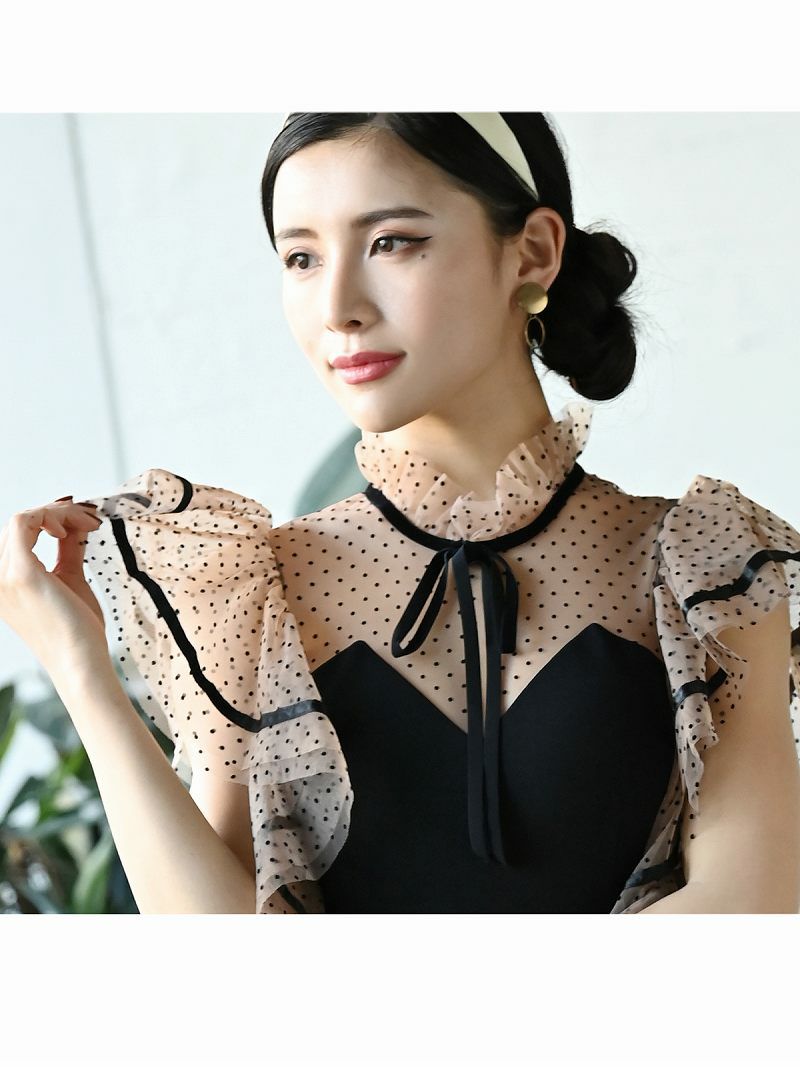 このドレスは、愛らしいドット柄とさりげない透け感で、女性らしさを引き立てるデザイン。デコルテラインを美しく見せることで、特別な瞬間を一層華やかに演出します♪