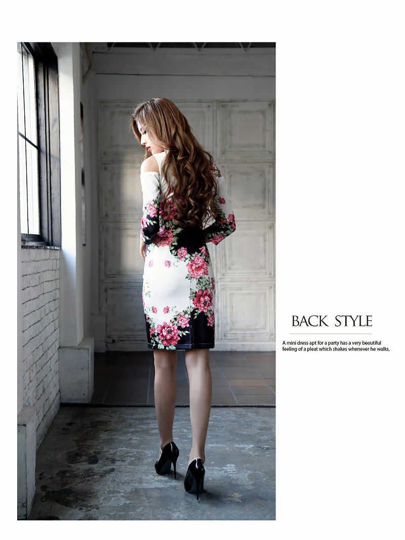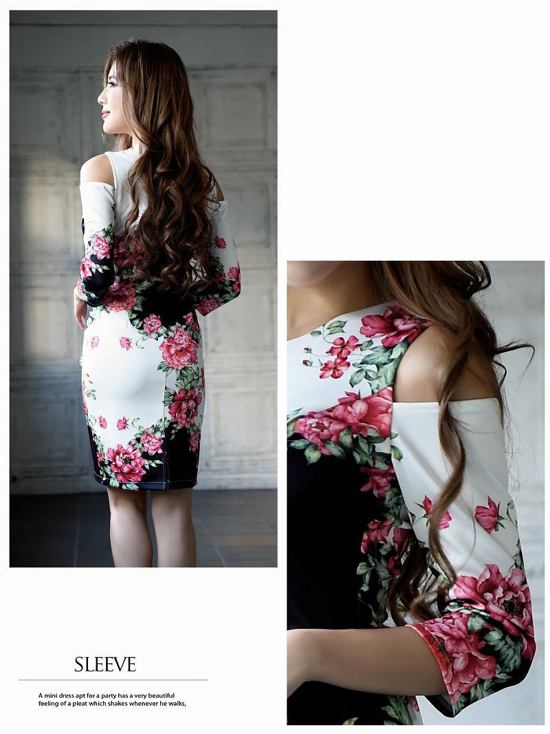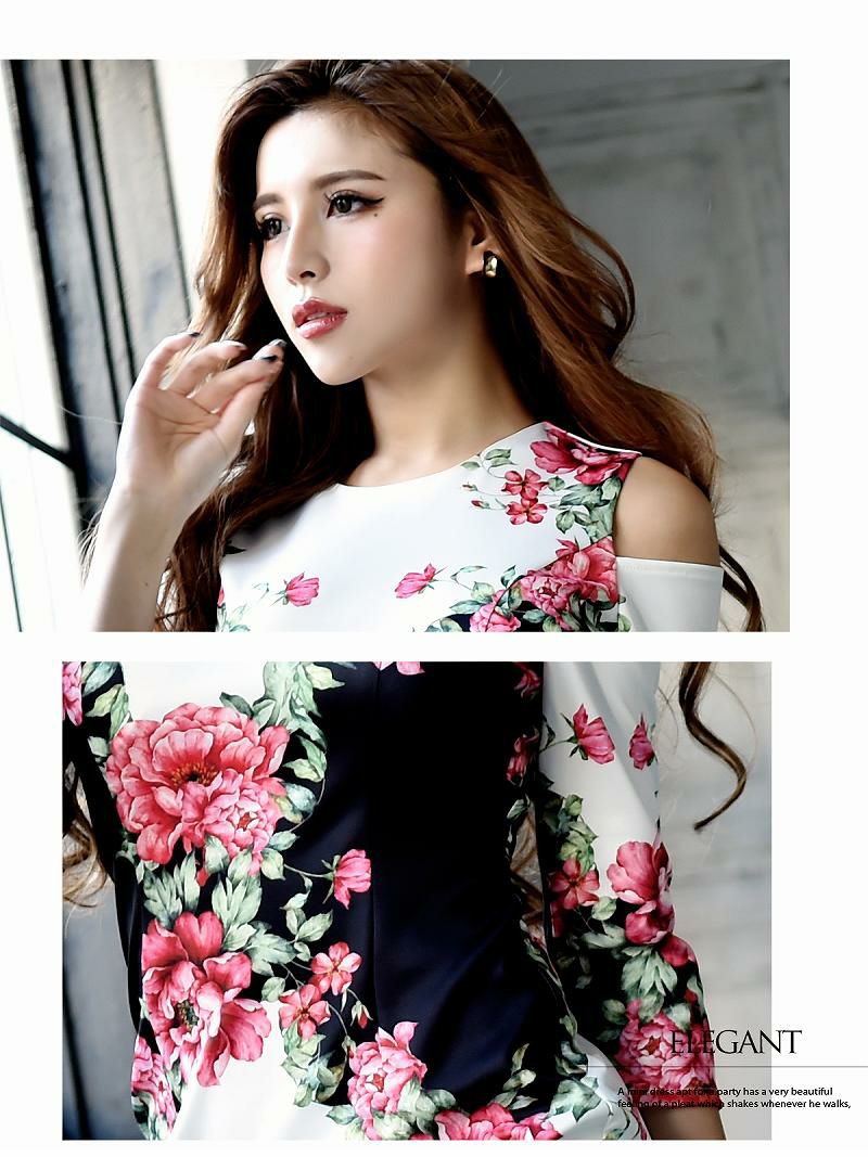 このキャバドレスは、オープンショルダーのデザインが特徴で、女性らしさを引き立てるスタイリッシュな一着です。