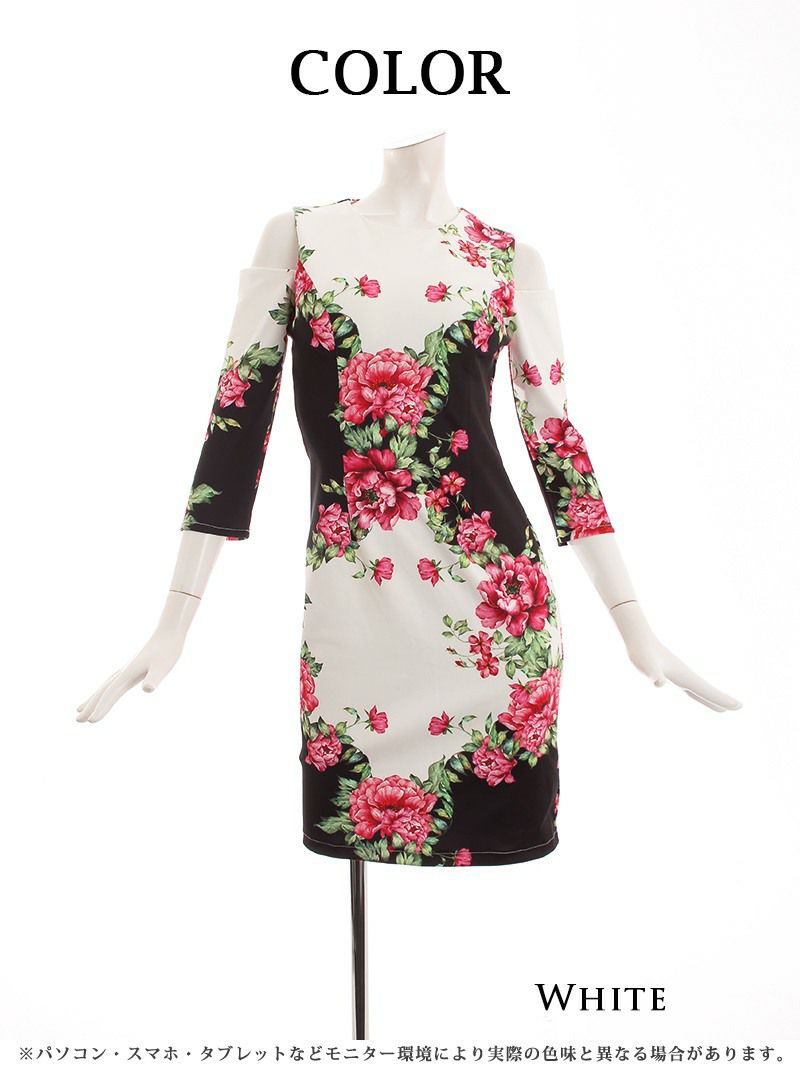 訳あり花柄sexy 【訳ありアウトレット】花柄タイト七分袖の膝丈韓国ワンピース【DAYS PIECE】(S/M/L/XL/XXL)(ホワイト)