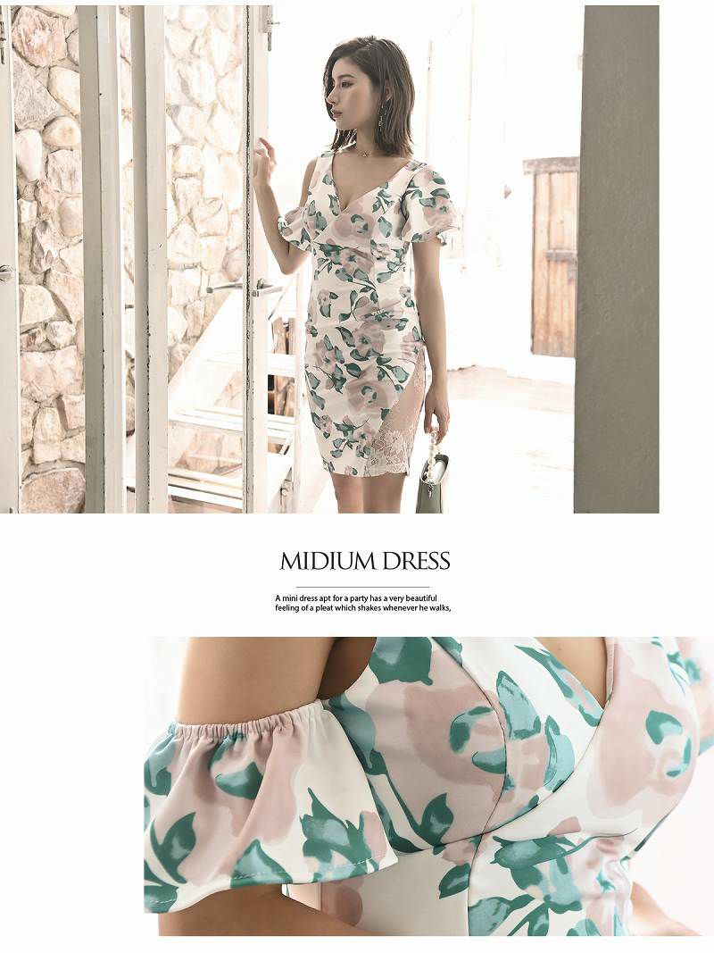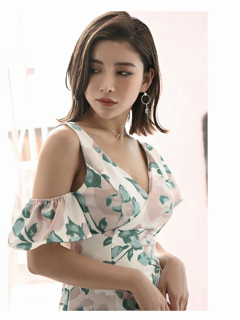シアー素材の花柄がフェミニンな印象を与えるカシュクールデザインのキャバワンピース。アシンメトリーでスタイリッシュな仕上がり。