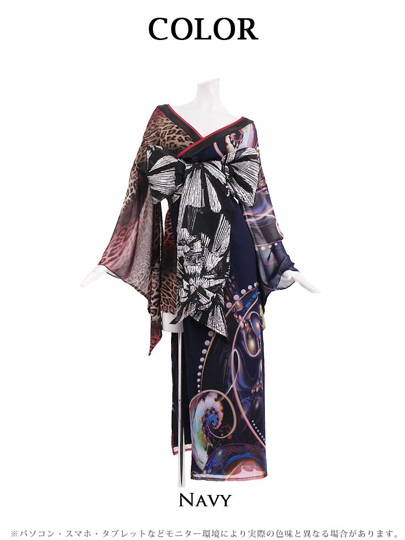 訳あり花魁dress 【訳ありアウトレット】半身柄の和風美女セクシー花魁和柄ドレス【流遊】(S/M/L/XL)(ネイビー)