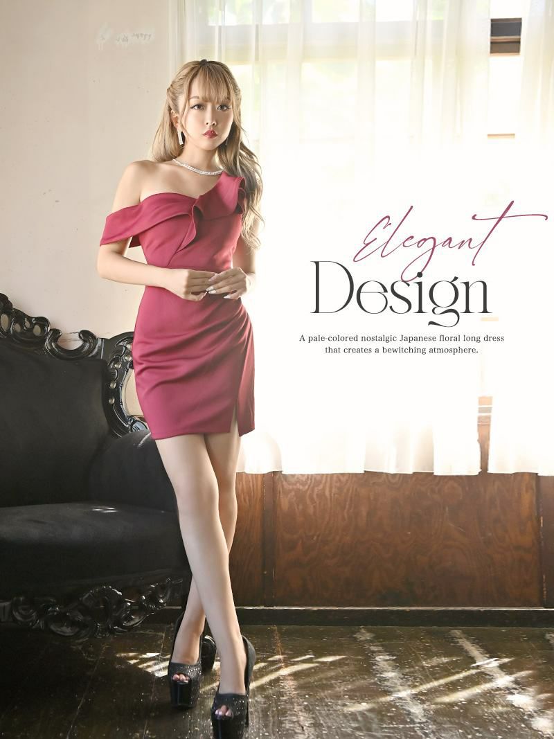 フリルデザインとアシンメトリーなシルエットで、華やかさと上品さを兼ね備えています。