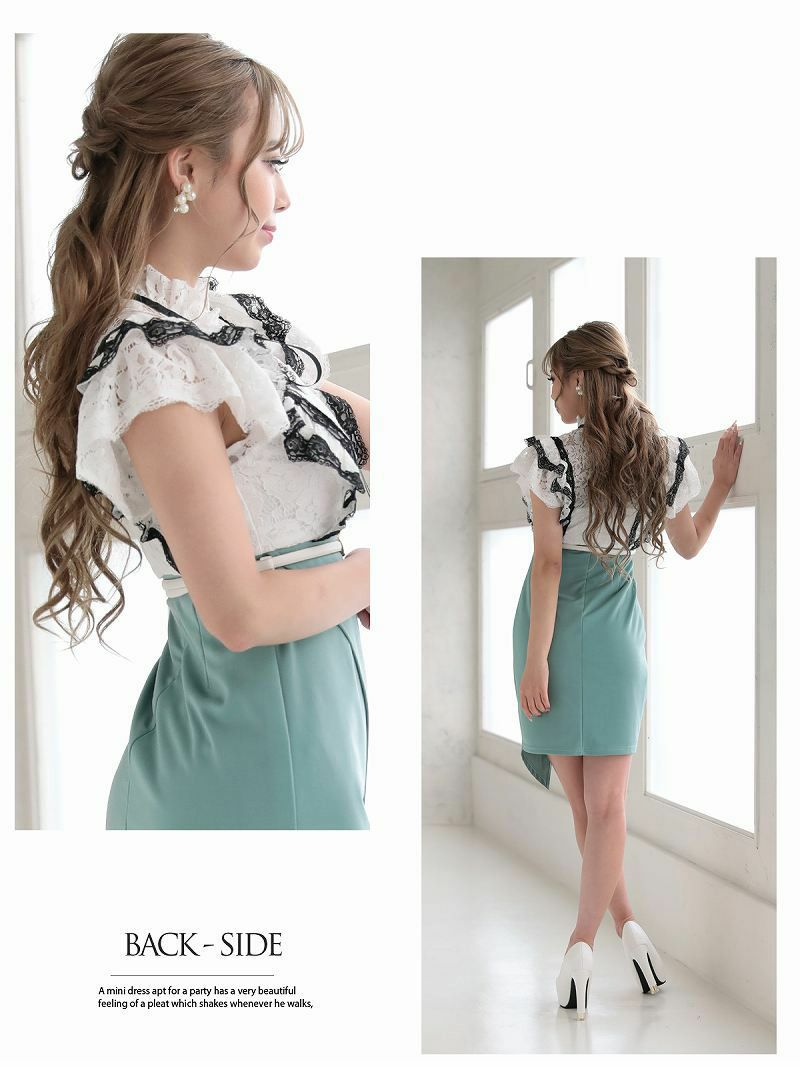7. ホワイトレース×ペールカラー袖ありバイカラーキャバクラドレス MIYU 着用キャバドレス【Ryuyu】(S/M/L)(ブルー/ミント/ダスティーピンク)