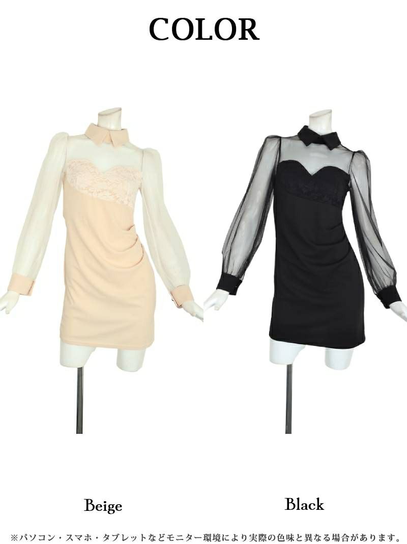4. 先行予約割¥2990→¥2841!※一部予約販売※襟付きシースルーデザイン袖付きミニドレス りせり 着用 キャバドレス【RyuyuChick】(M/L)(ブラック/ベージュ)
