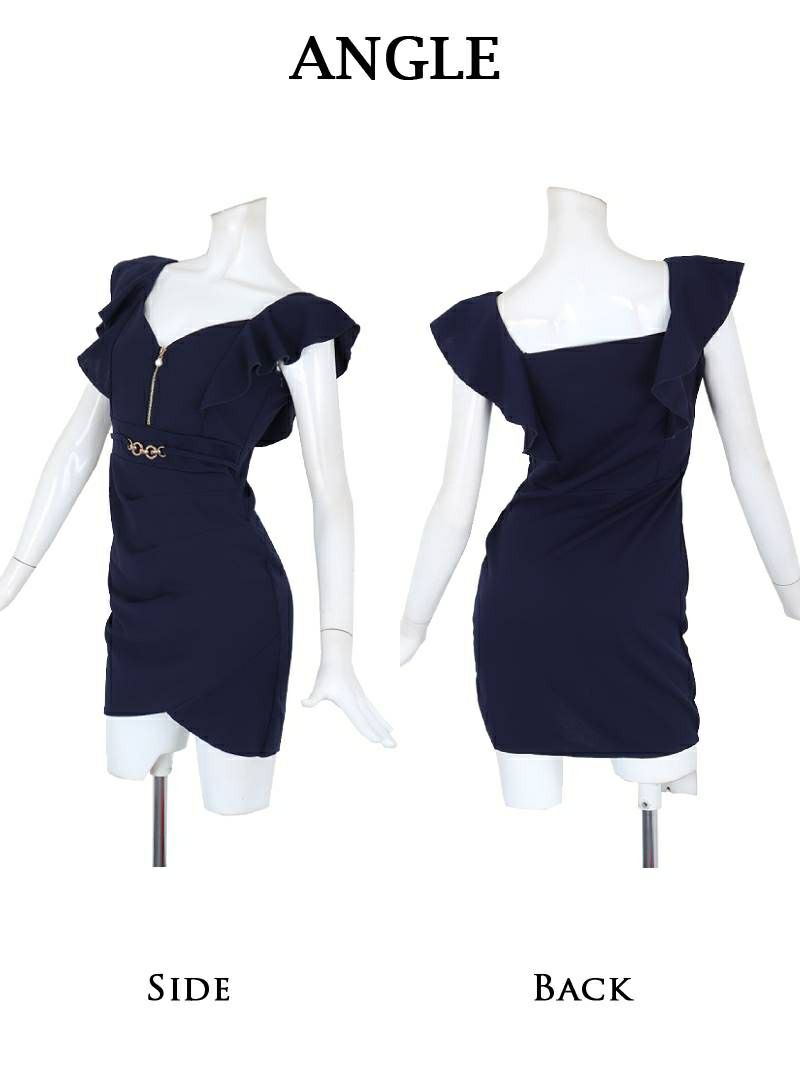 4. バストジップ×フリル袖のビットベルト付きタイトミニドレス りせり 着用 キャバドレス【RyuyuChick】(M/L/XL(2L))(ブラック/ネイビー/グリーン/ワイン)
