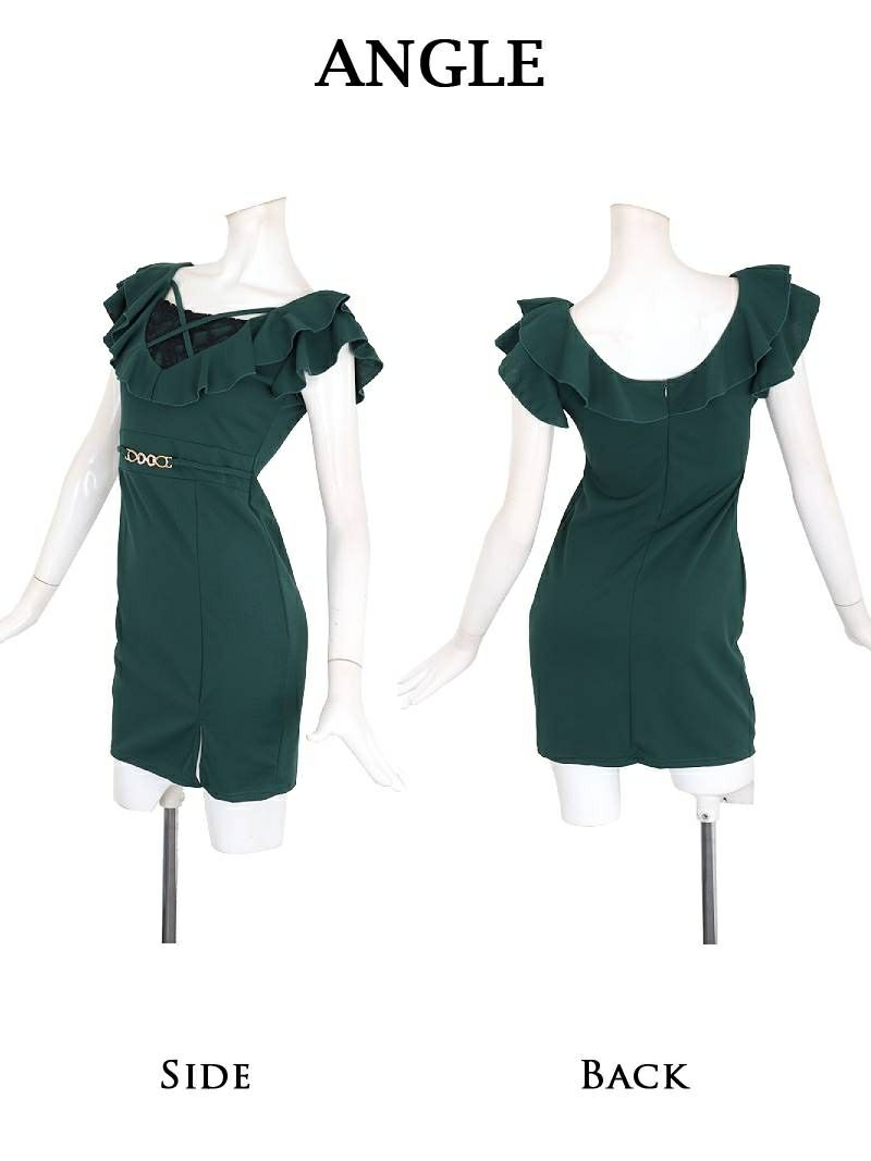 胸元を隠したい方必見 谷間隠しデザインのフリル袖付きキャバドレス りせり 着用 ミニドレス【RyuyuChick】(M/L)(グリーン/ネイビー/ワイン)
