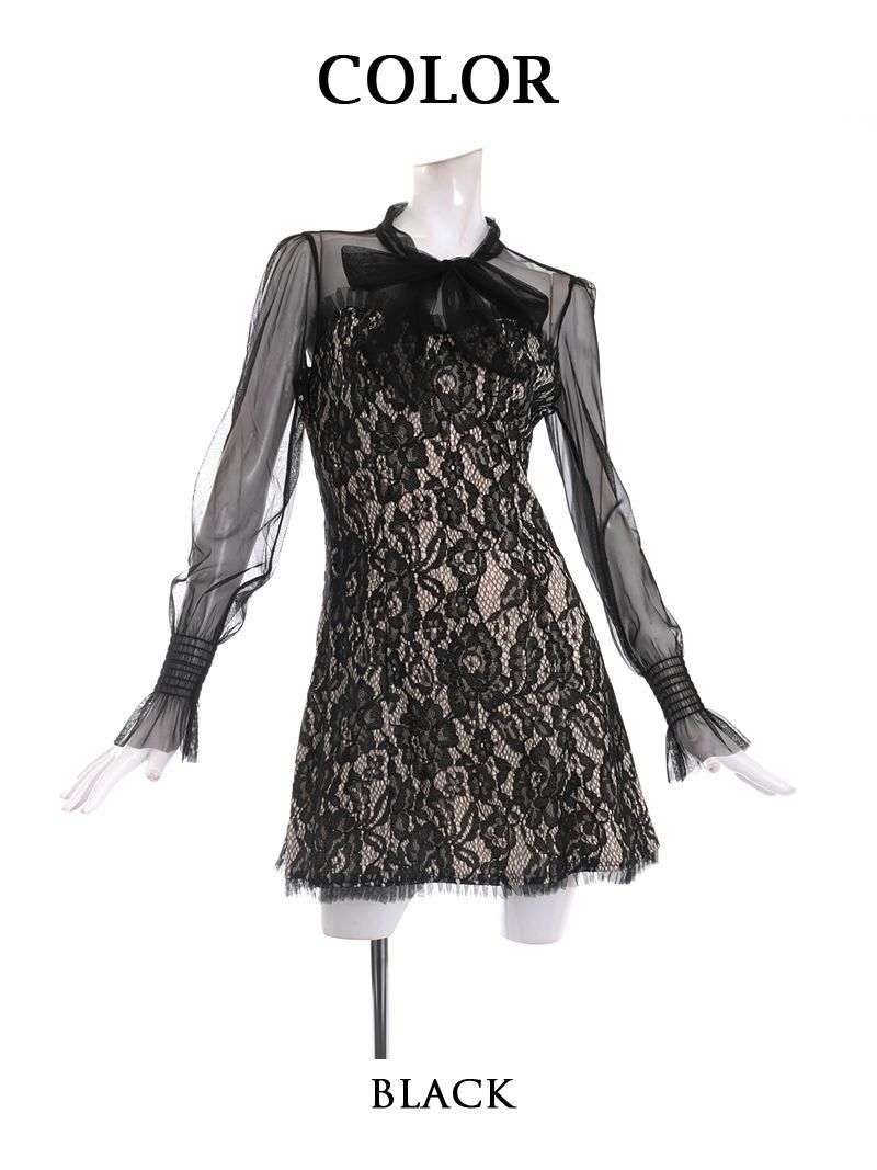 6. 【訳ありアウトレット】透けレースの長袖キャバミニドレス【RyuyuChick】(S/M/L/XL)(ブラック)