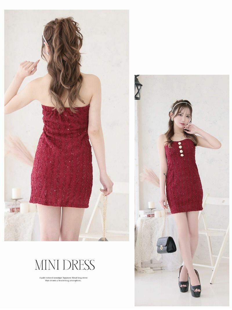 5. 先行予約割¥4380→¥4160!※予約販売※煌めくスパンコールツイードが目を引くゴールドボタン付きベアタイトミニドレス【RyuyuChick】(S/M/L)(ワイン)