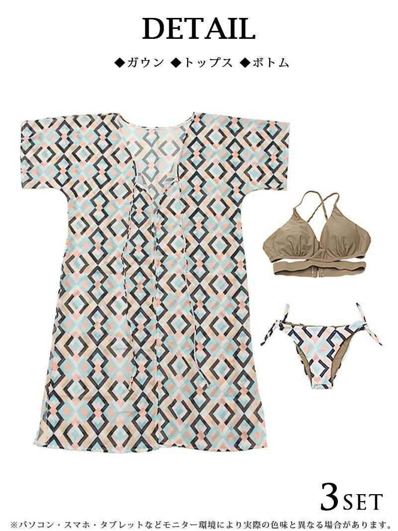 ヘルシーカラーのビキニと、レトロ柄のショーツとガウンの3点セット。