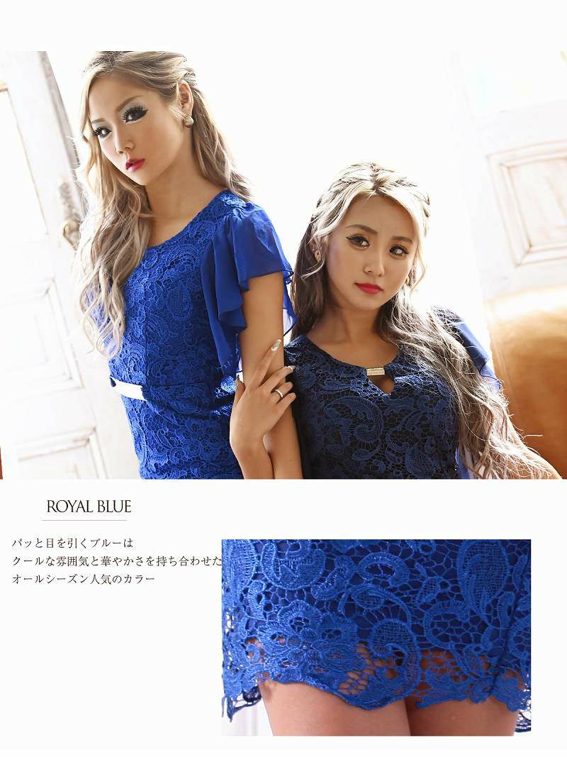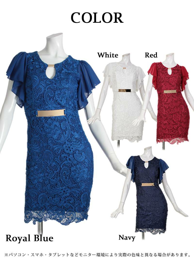 華やかに魅せる エレガントフレア袖レースミニドレス【Ryuyu】(S/M/L/XL/XXL)(ホワイト/レッド/ネイビー/ロイヤルブルー)