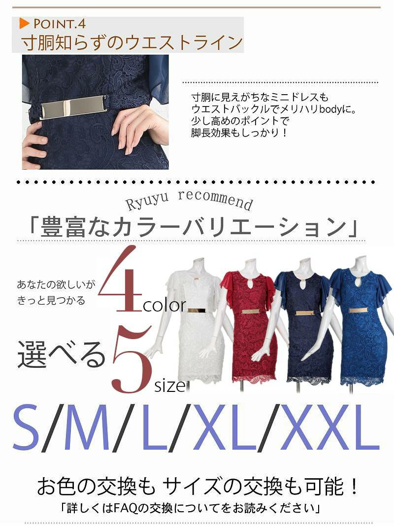 4. エレガントフレア袖レースミニドレス【Ryuyu】(S/M/L/XL/XXL)(ホワイト/レッド/ネイビー/ロイヤルブルー)