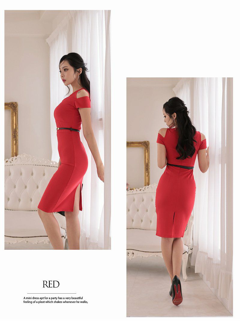4. オープンショルダー袖付き膝丈セレブラウンジワンピース KANO 着用 韓国ドレス【DAYS PIECE】(S/M/L/XL)(レッド)